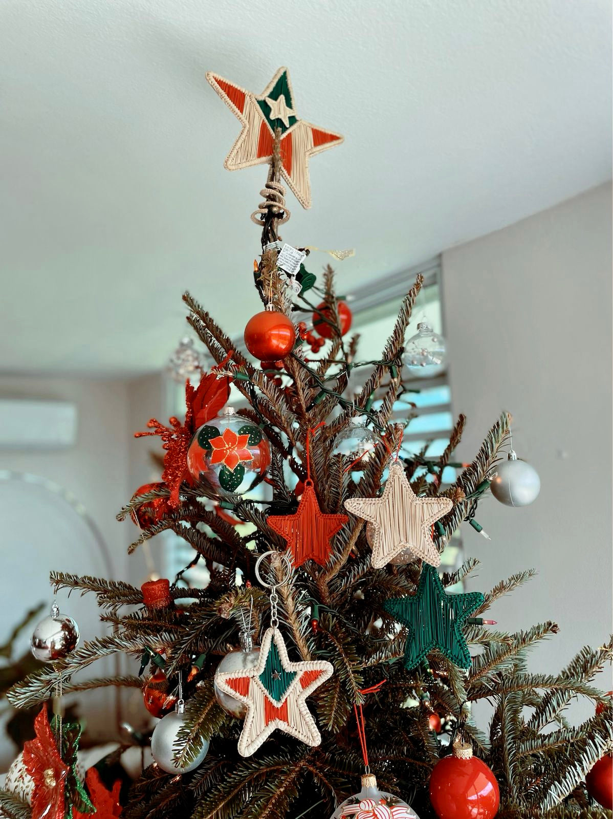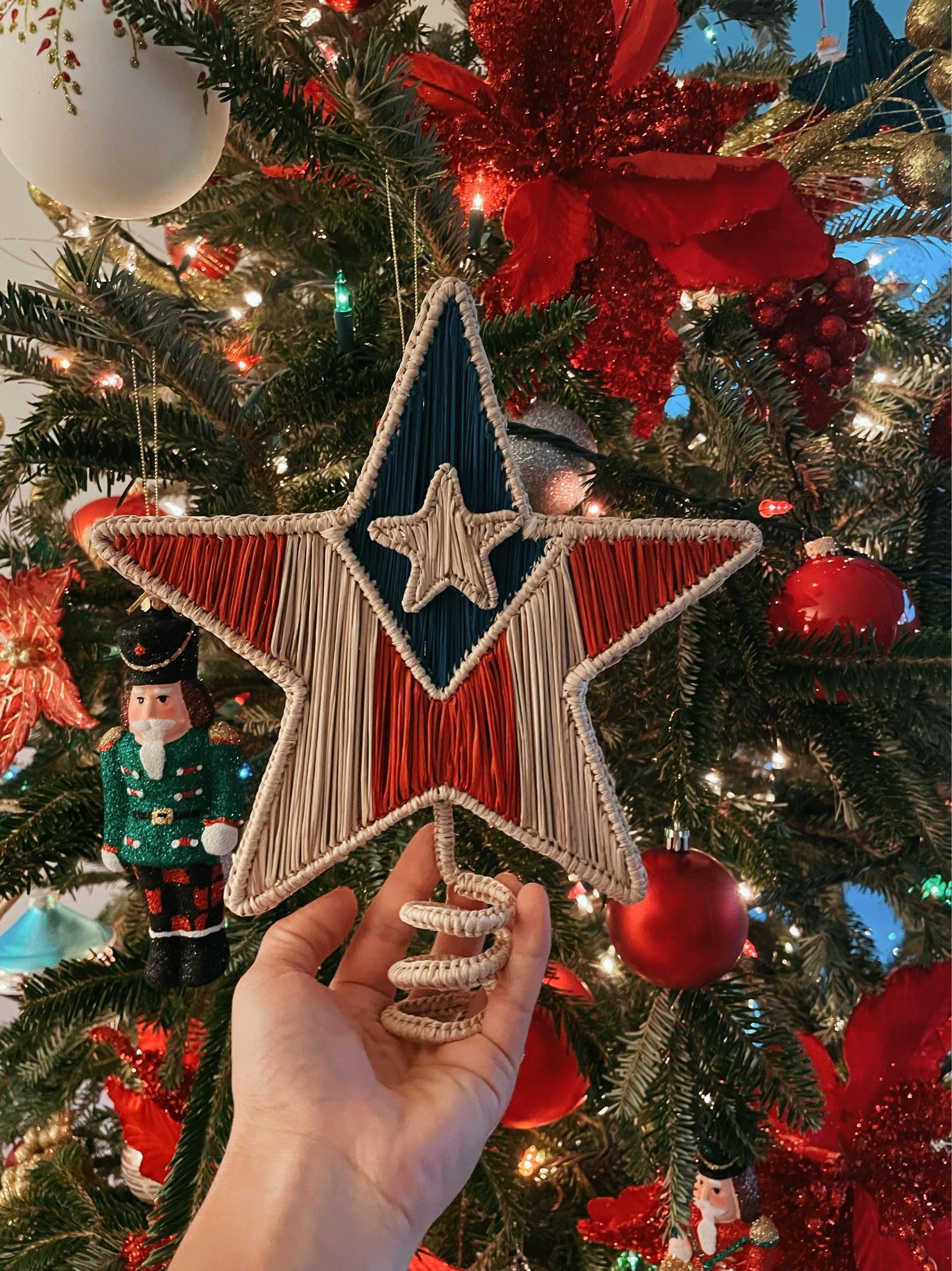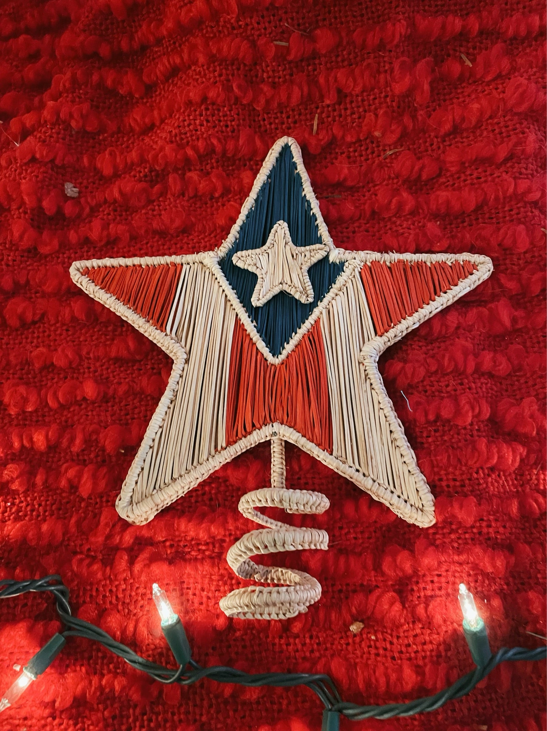 This beautiful and one of a kind handmade Puerto Rico Christmas tree topper honors our beautiful Puerto Rican flag and island. It's woven from authentic and sturdy Iraca Palm fibers from the Caribbean coast. Each artisan puts her soul into making this beauty.  You are purchasing a true piece of art.