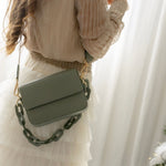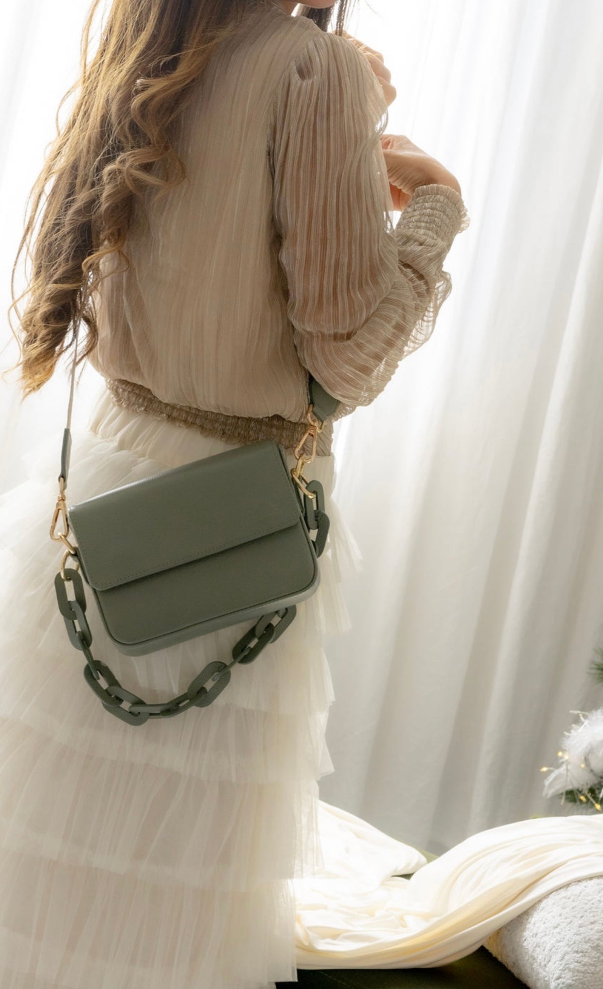 100% cuero con chain en cuero y strap en cuero tono a tono, incluye accesorio del mismo color de la cartera.