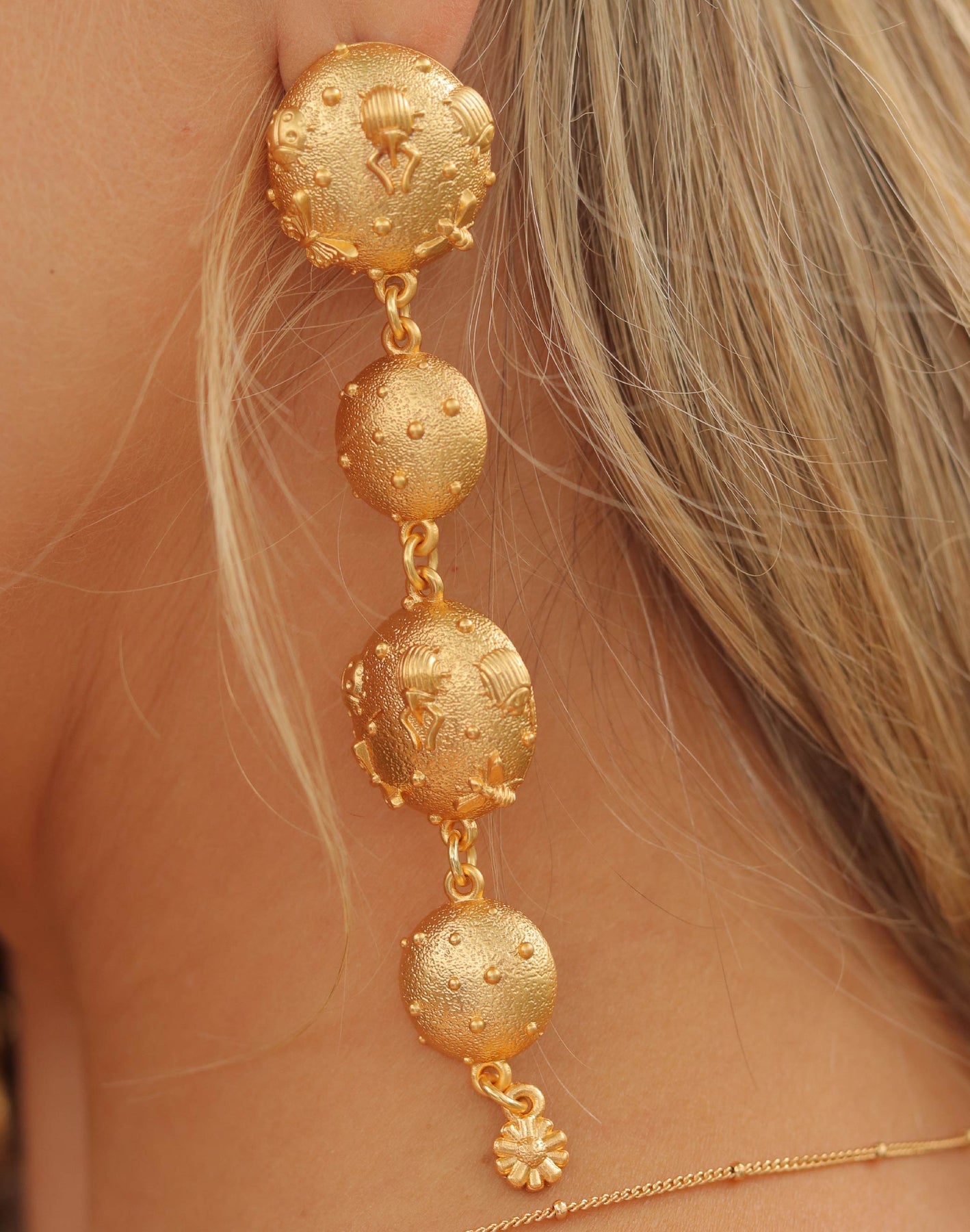 Nectar was believed to be drank by mythological gods to sweeten their days. It is also the base of nature. In this long earrings necklace each link has a unique design and texture with beetles inspired by spring and nature. These are the perfect earrings for you not to go unnoticed anytime.