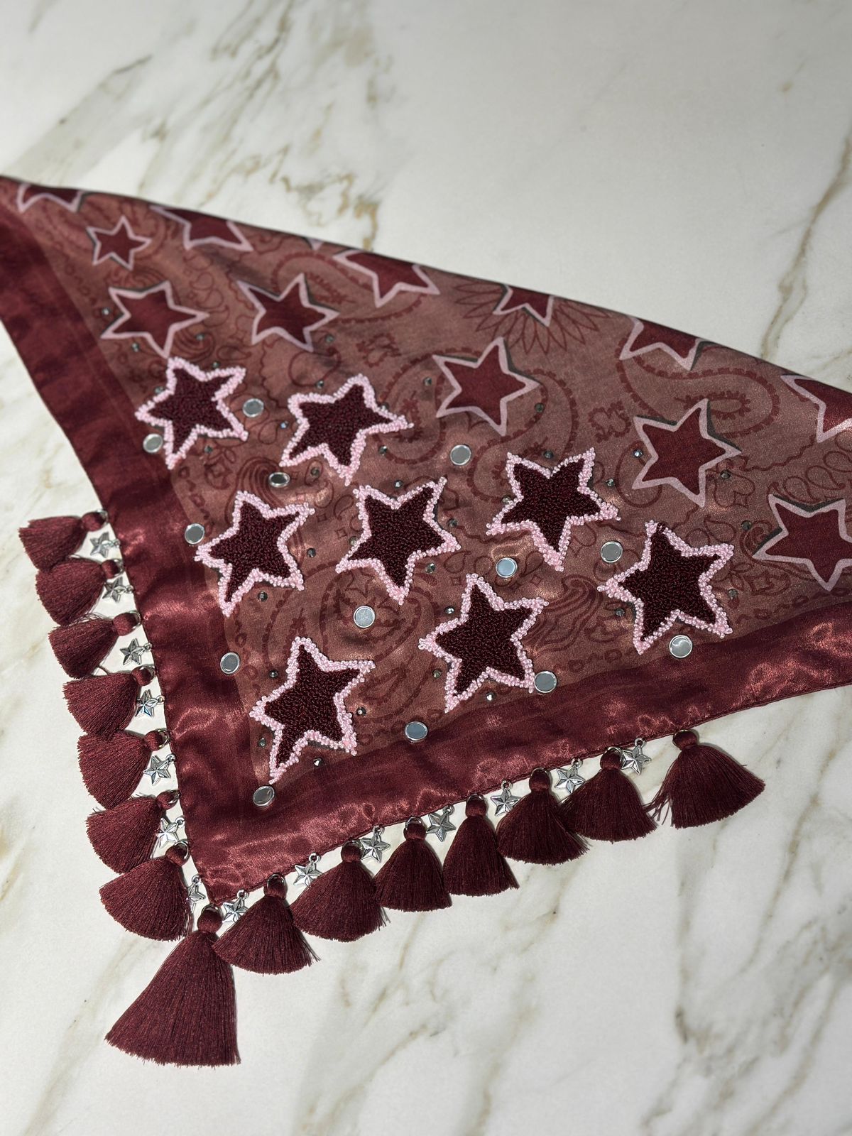 This 100% handmade scarf will give your attire a special touch. In these, the technique of hand embroidery is elevated with crystals, shisha mirrors, coins, and decorative tassels.