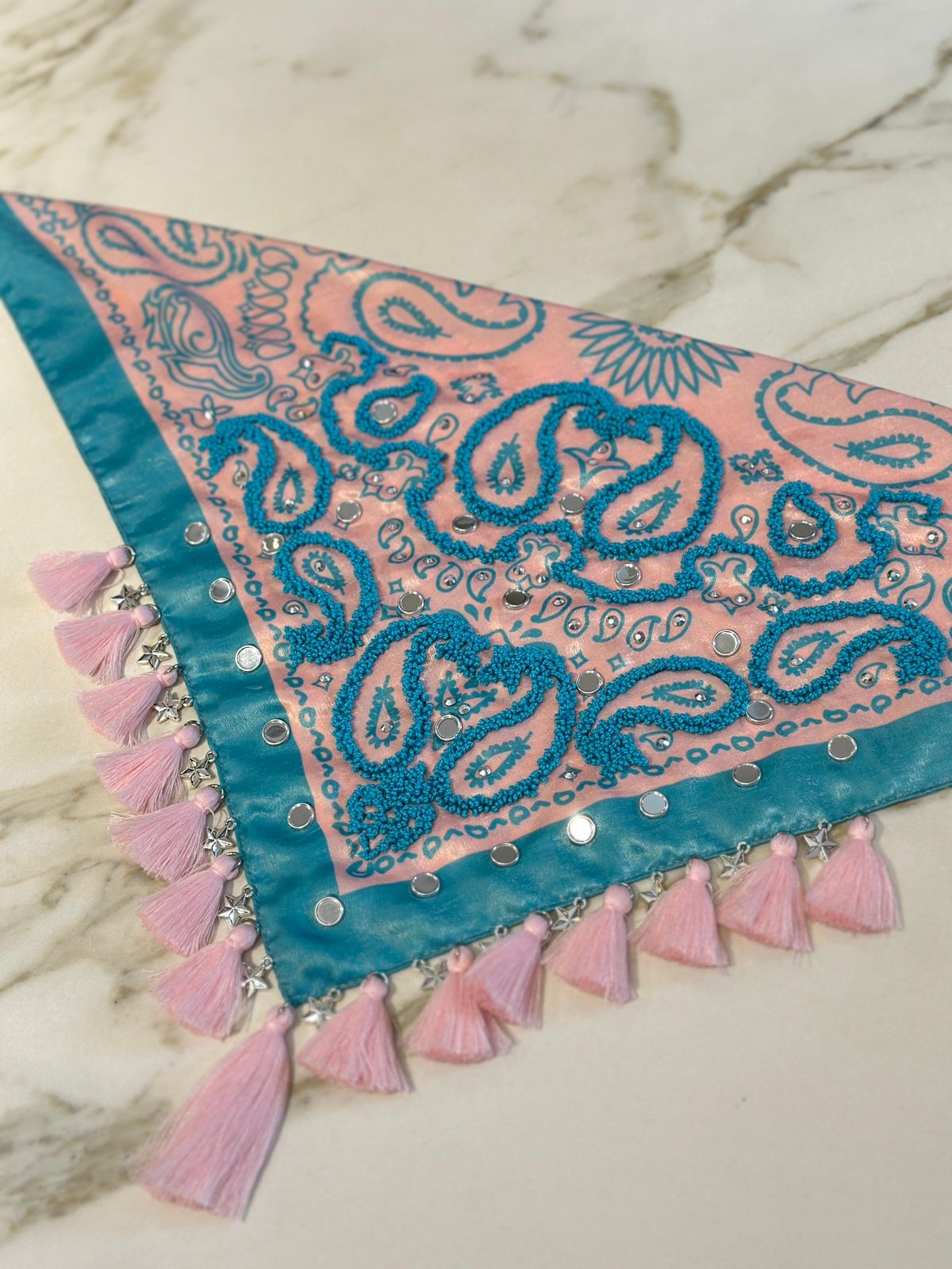 This 100% handmade scarf will give your attire a special touch. In these, the technique of hand embroidery is elevated with crystals, shisha mirrors, coins, and decorative tassels.
