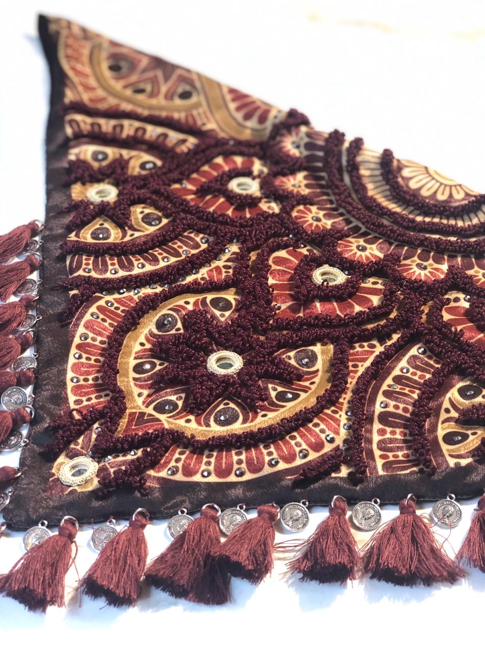 This 100% handmade scarf will give your attire a special touch. In these, the technique of hand embroidery is elevated with crystals, shisha mirrors, coins, and decorative tassels.