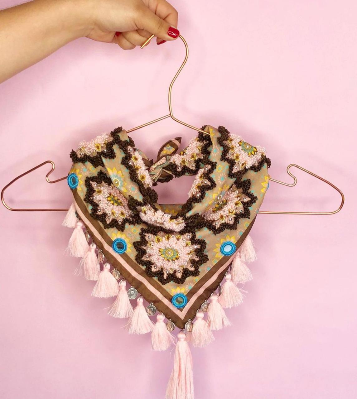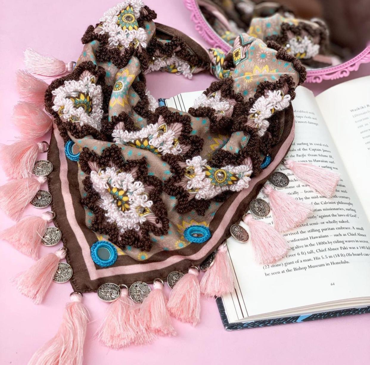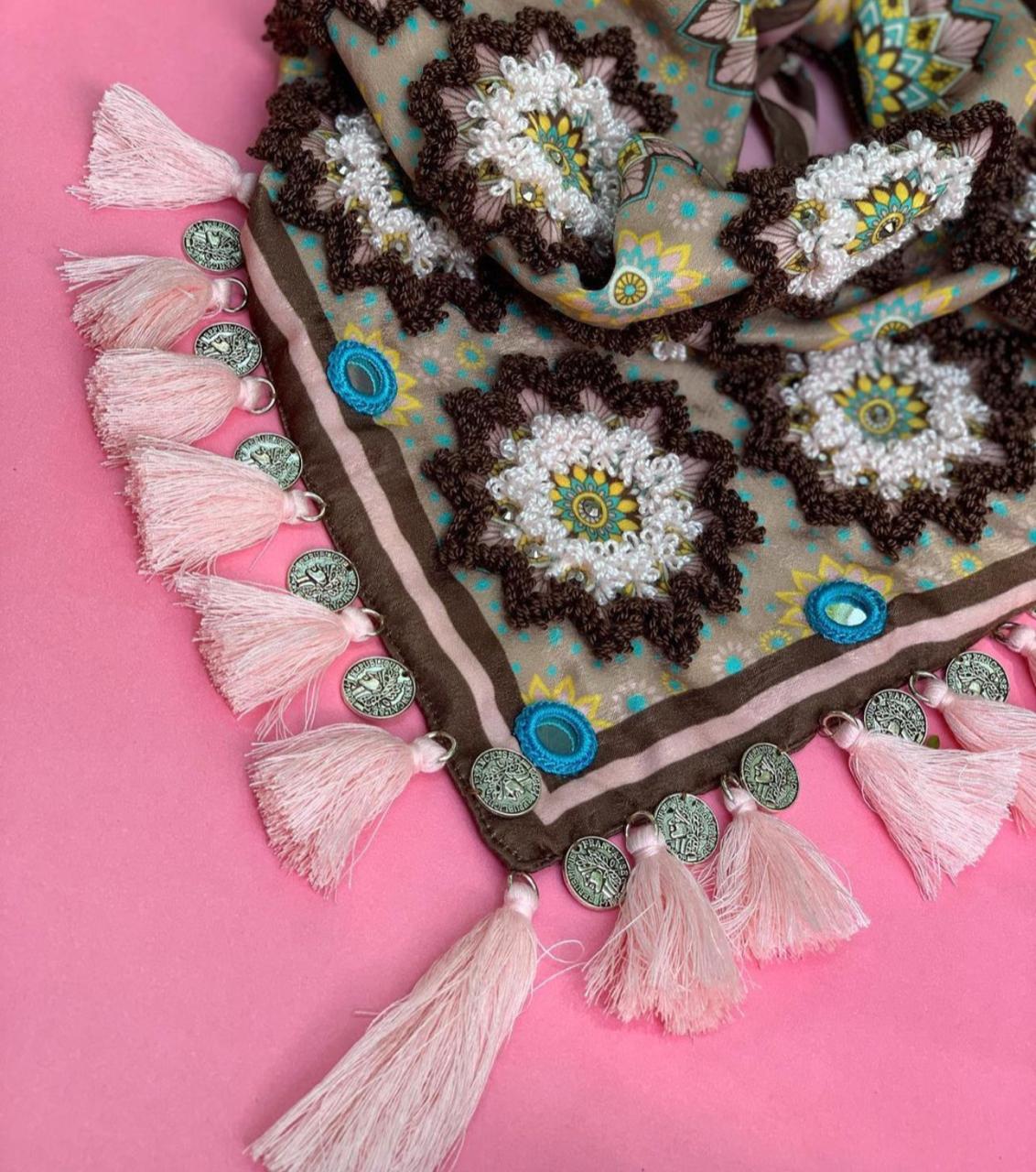 100% handmade scarf that will give your outfit a special touch. Adorned with tiny tassels, small crystals, shisha mirrors, small coins, and decorative fringes.