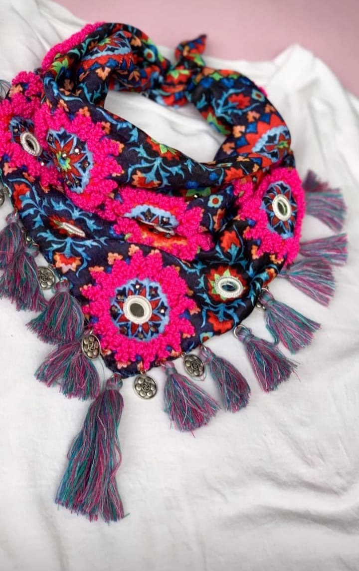 This 100% handmade scarf will give your attire a special touch. In these, the technique of hand embroidery is elevated with crystals, shisha mirrors, coins, and decorative tassels.