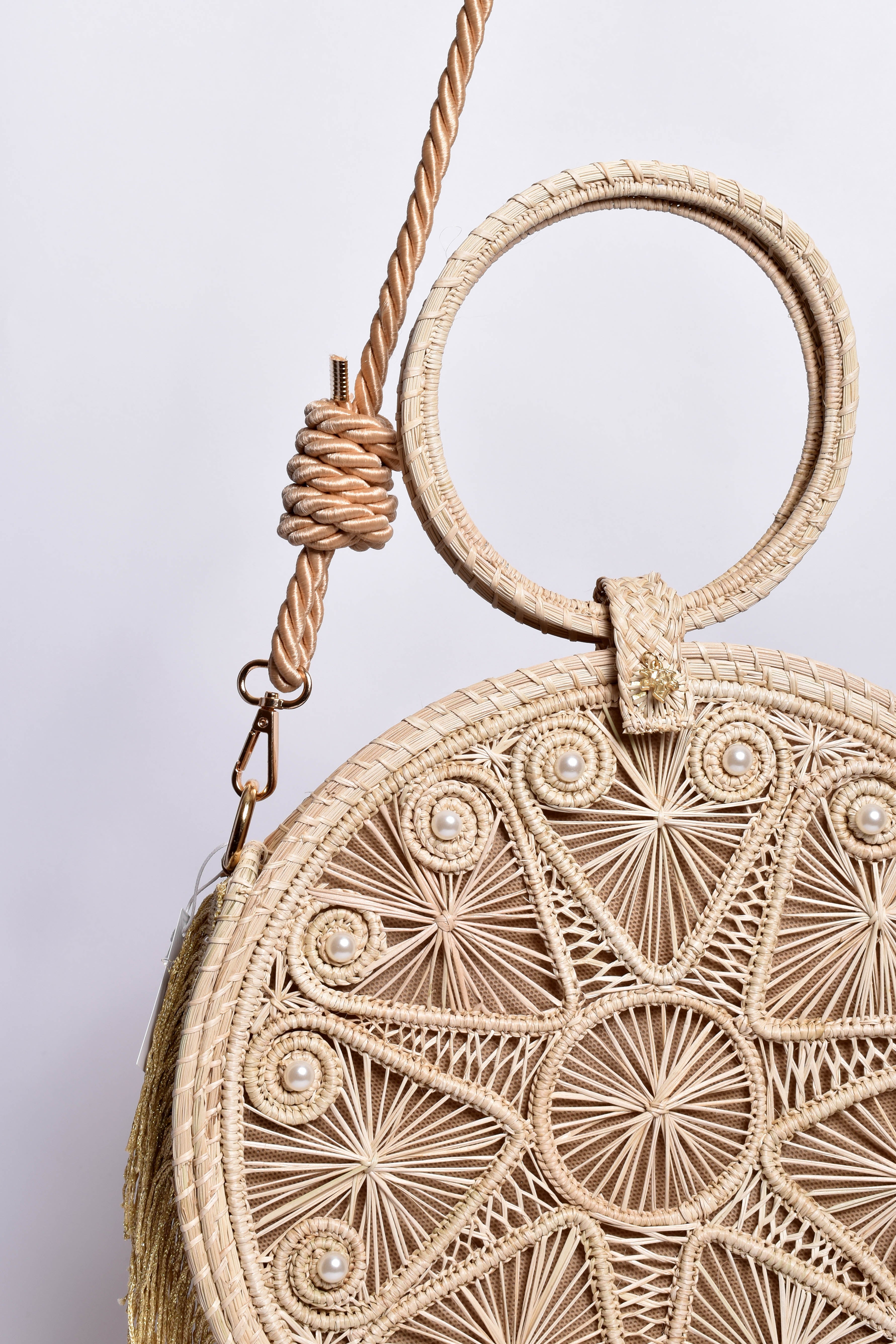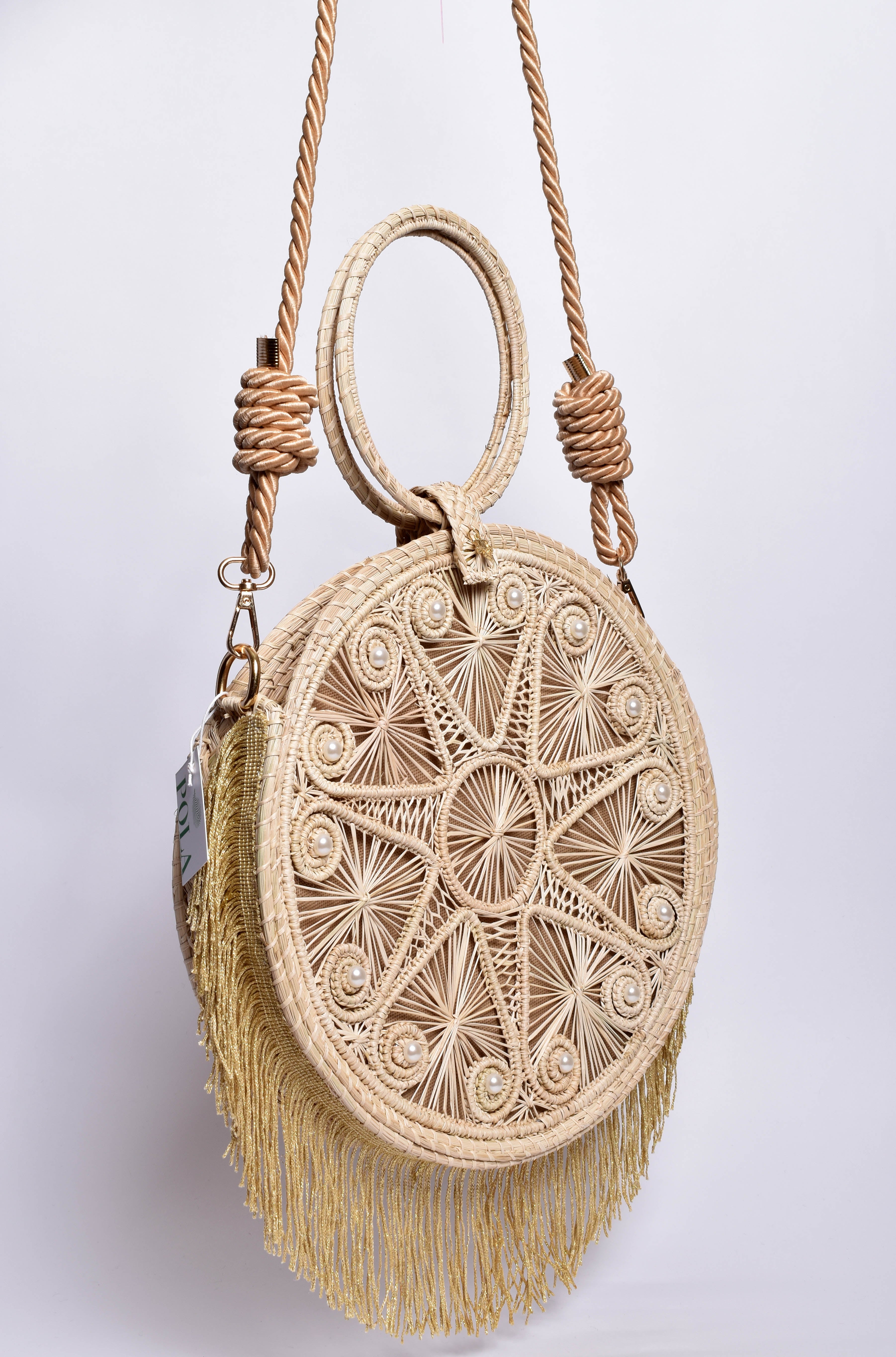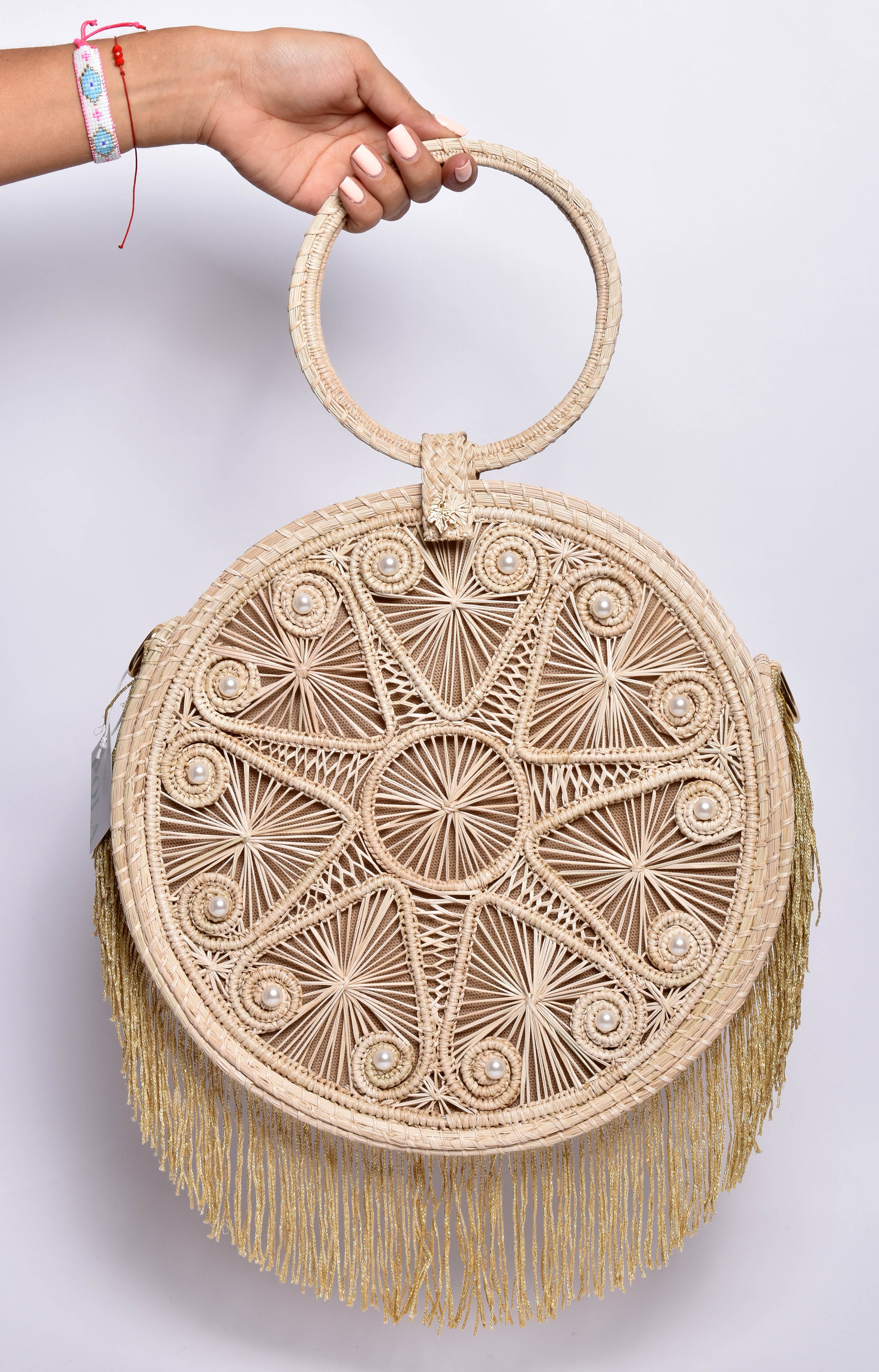 Stylish 2-in-1 crossbody and handbag with fringes and decorated with pearl accents. Its beautiful circular handles elevate the personality of this piece of art. Woven from authentic and sturdy Iraca Palm fibers from the Caribbean coast. Each artisan puts her heart into making this beauty.