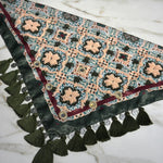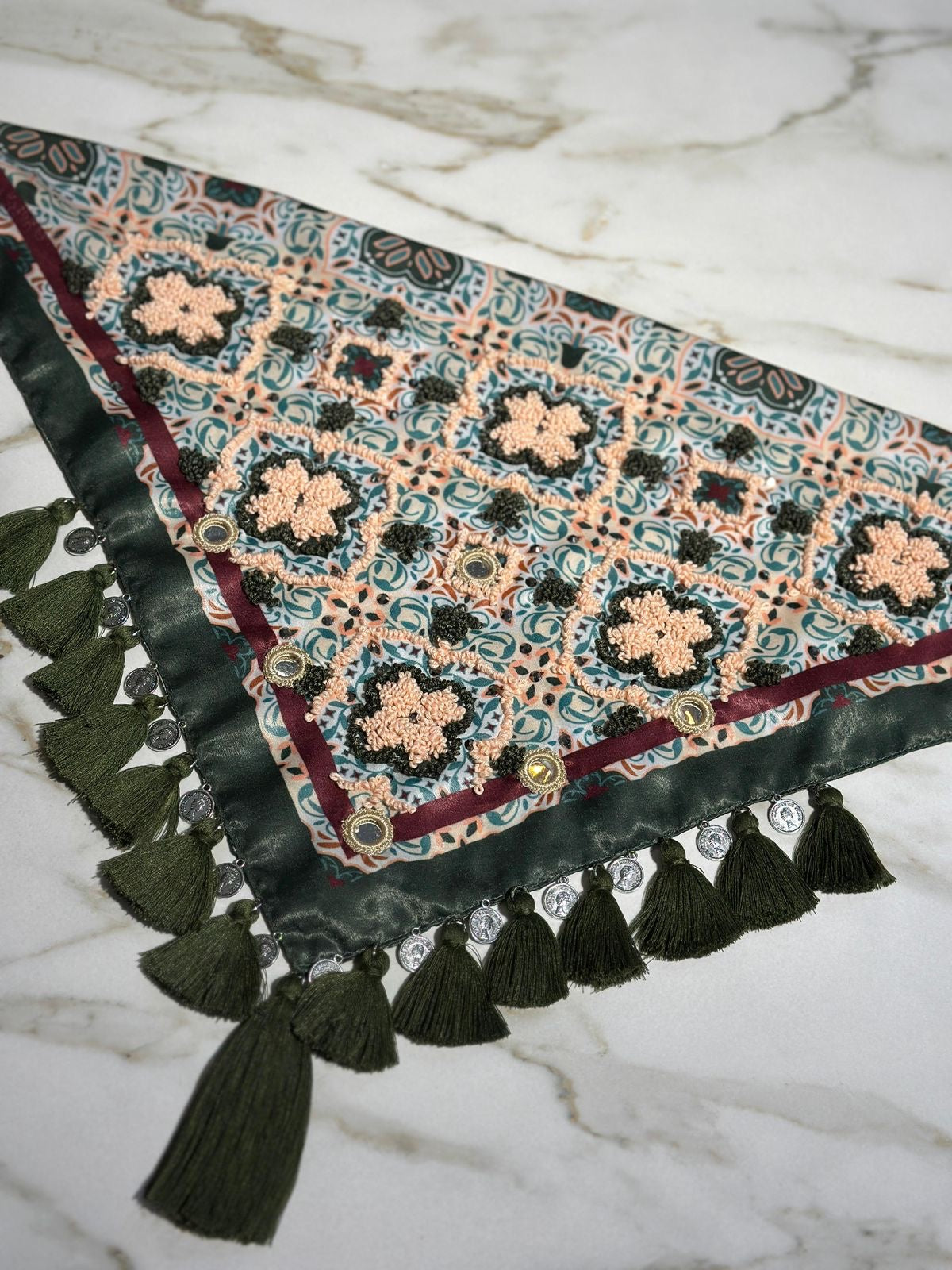 This 100% handmade scarf will give your attire a special touch. In these, the technique of hand embroidery is elevated with crystals, shisha mirrors, coins, and decorative tassels.