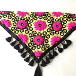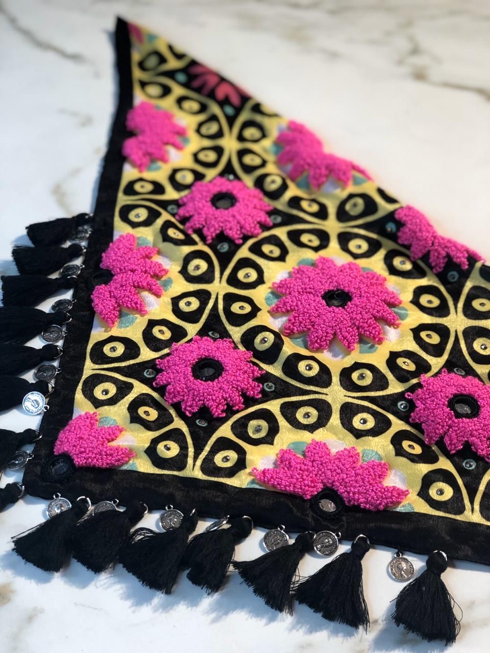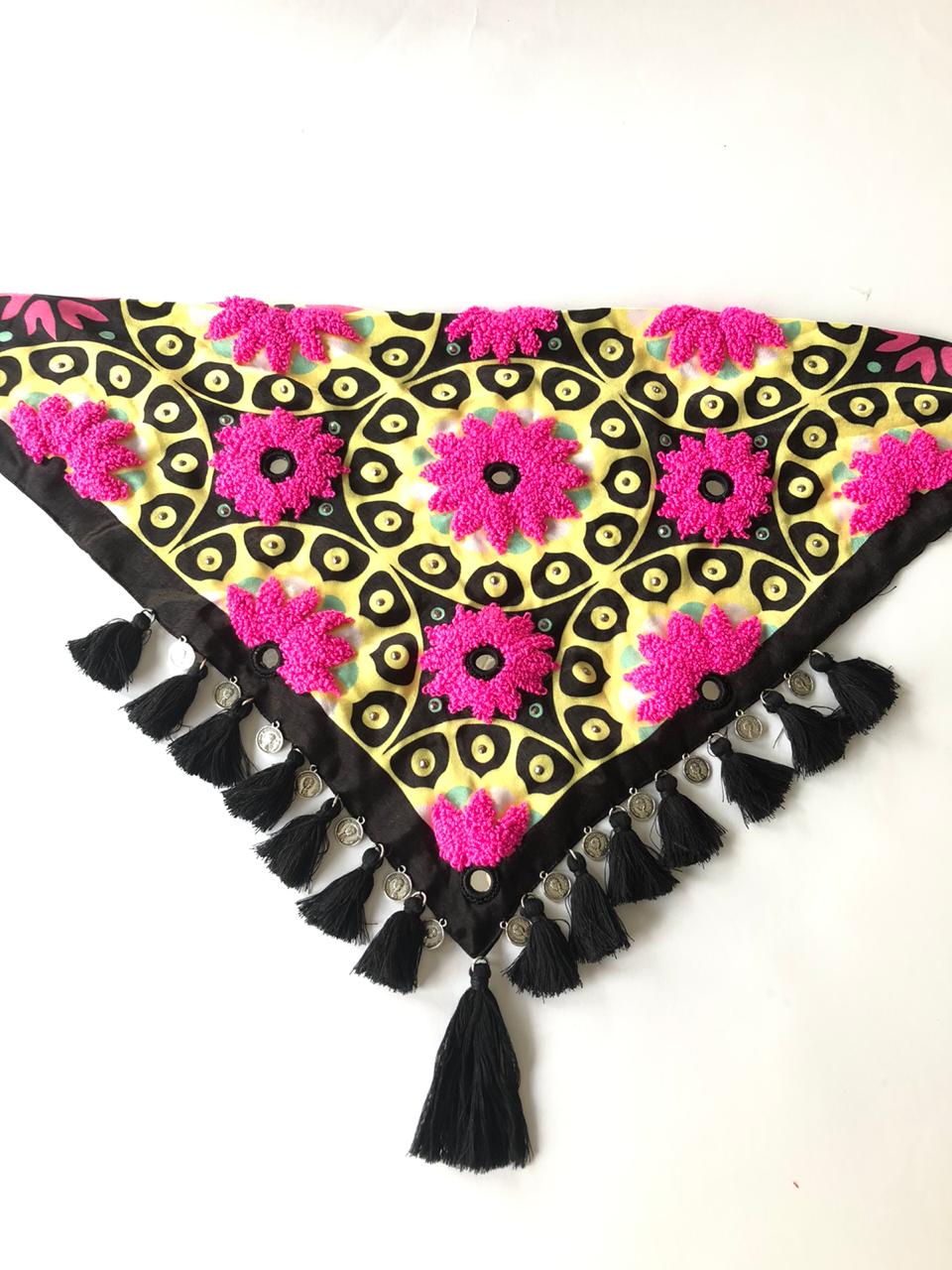 This 100% handmade scarf will give your attire a special touch. In these, the technique of hand embroidery is elevated with crystals, shisha mirrors, coins, and decorative tassels.