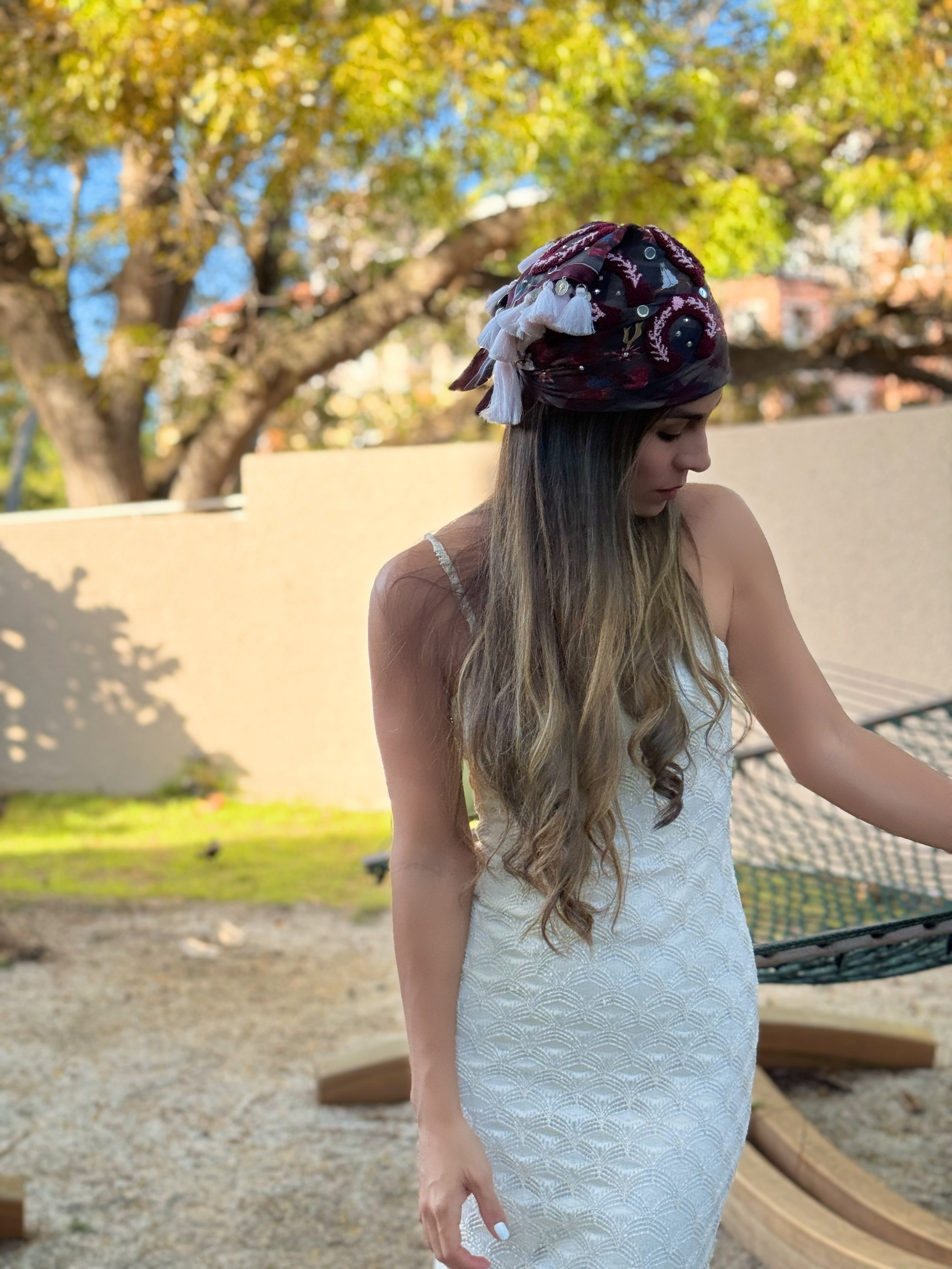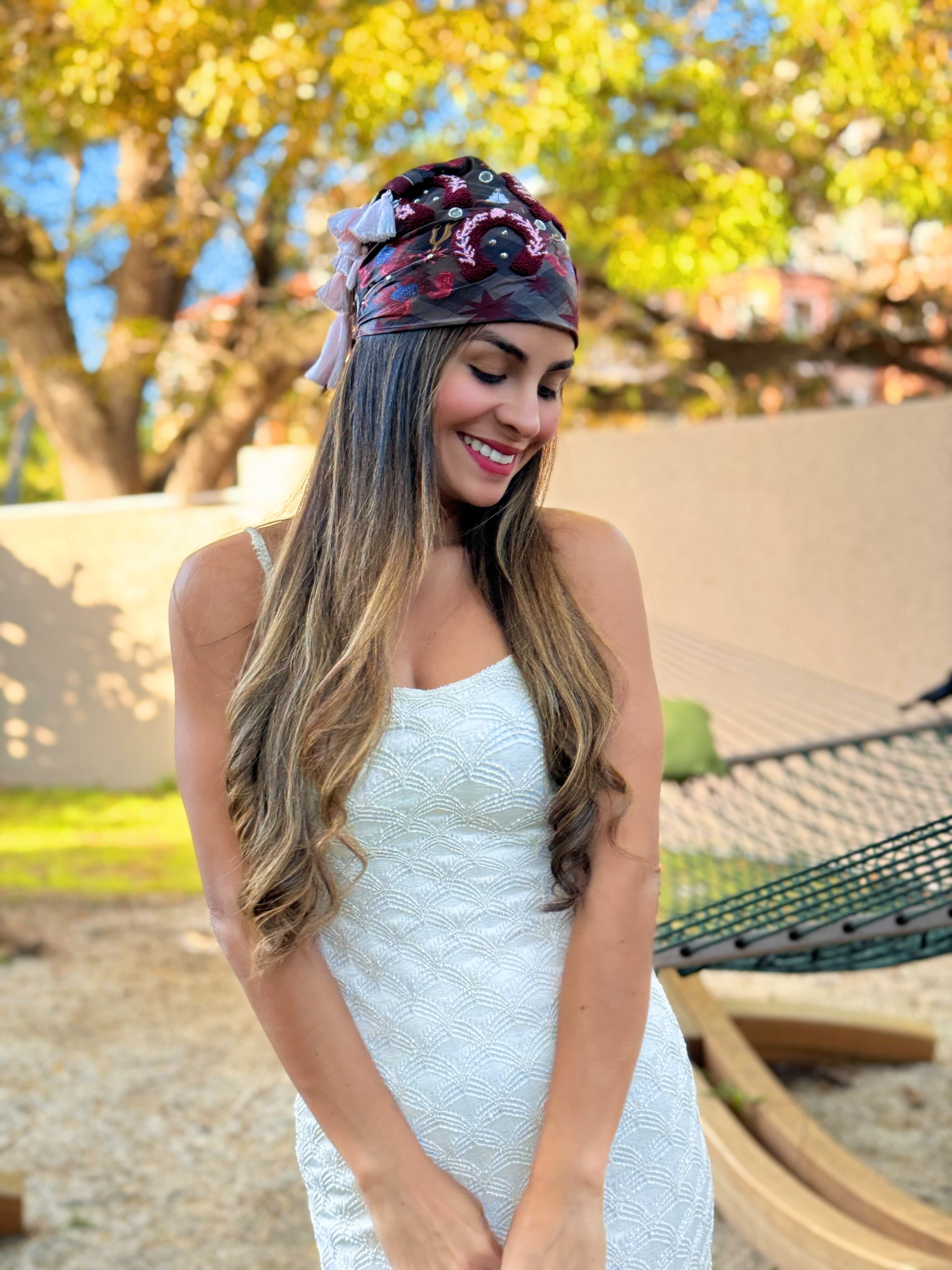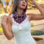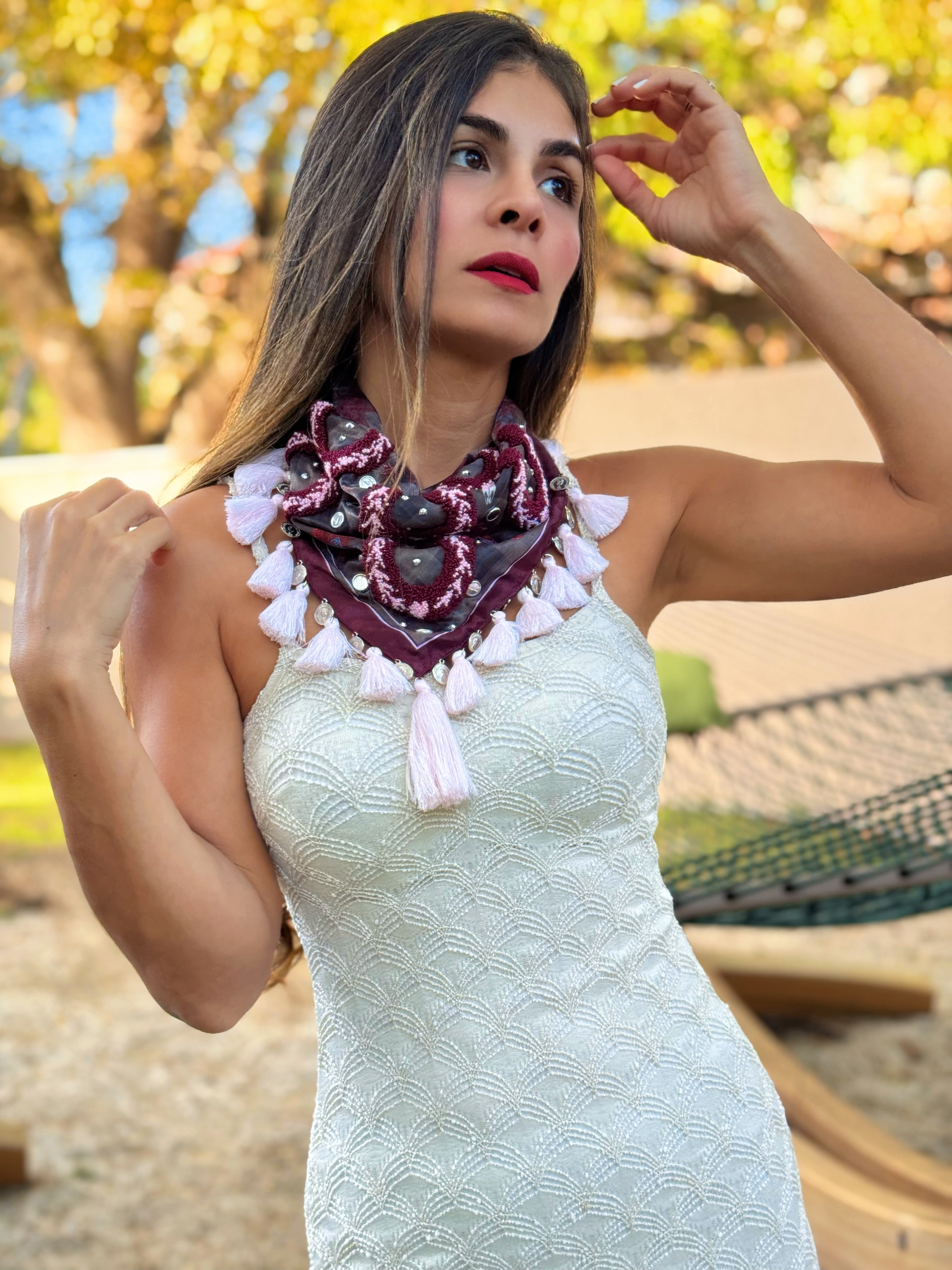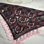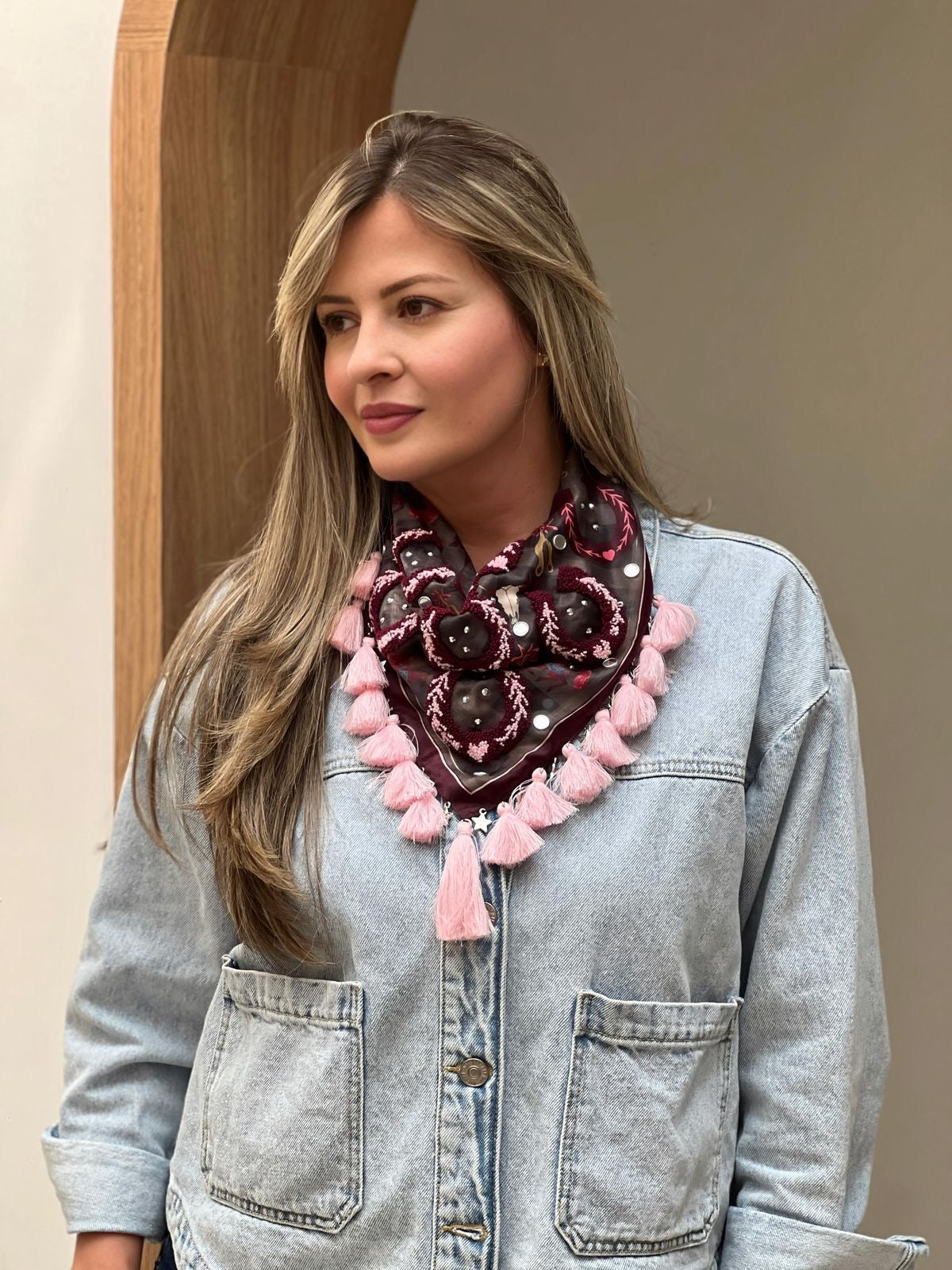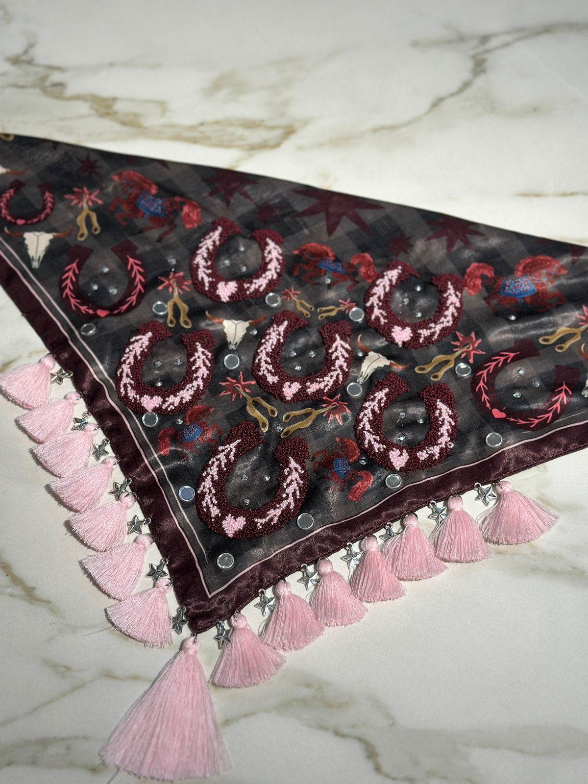 This 100% handmade scarf will give your attire a special touch. In these, the technique of hand embroidery is elevated with crystals, shisha mirrors, coins, and decorative tassels.