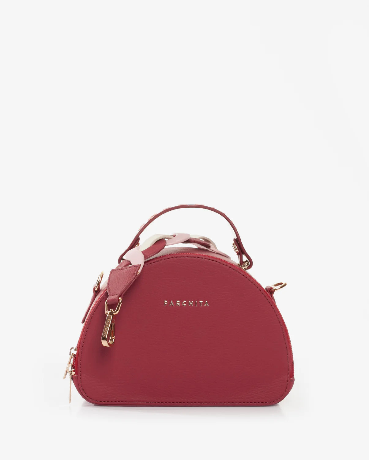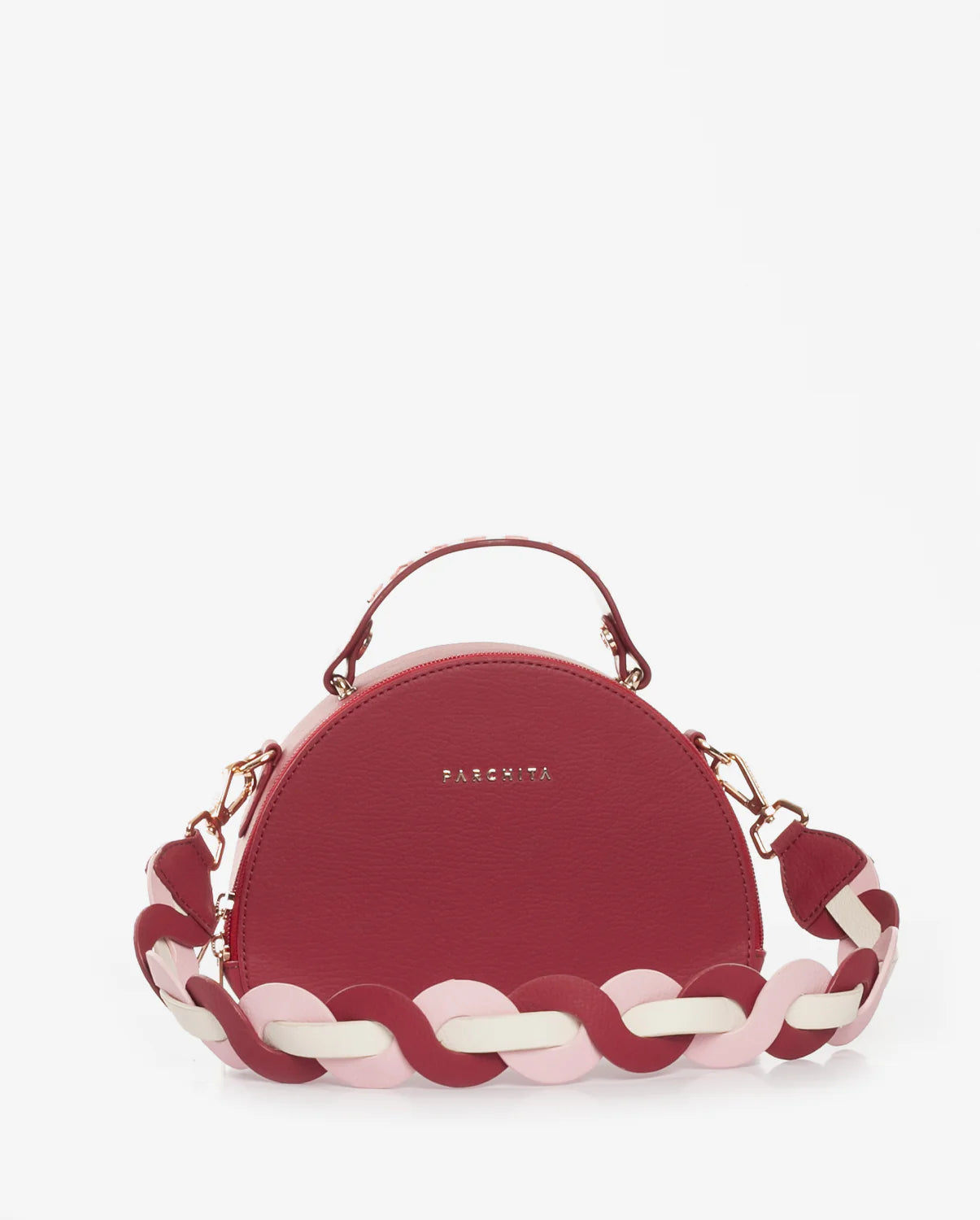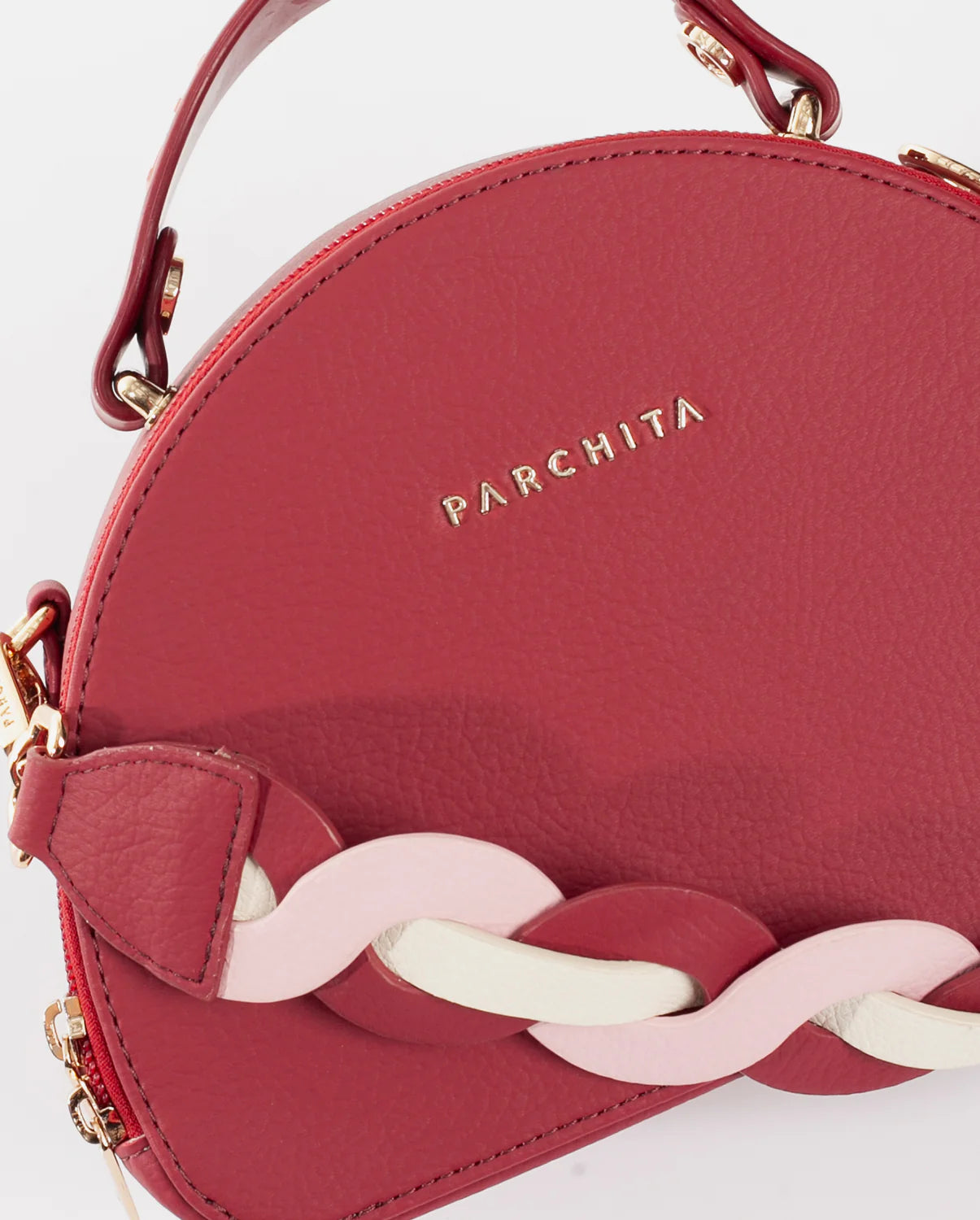 Cartera estructurada en PVC con silueta curva y base plana. Su diseño incorpora un doble cierre metálico y una manija en caucho con aroma a chicle, que destaca por su color en contraste, mientras que su bolsillo interno tipo parche en espaldar te permite llevar tus objetos organizados. Incluye un asa removible elaborada mediante el entrelazado de tres tonos, un detalle que equilibra la modernidad con la artesanía. Una pieza versátil y elegante, perfecta para elevar cualquier look con un aire contemporáneo, alegre y sofisticado.