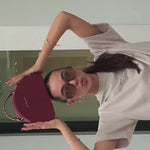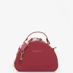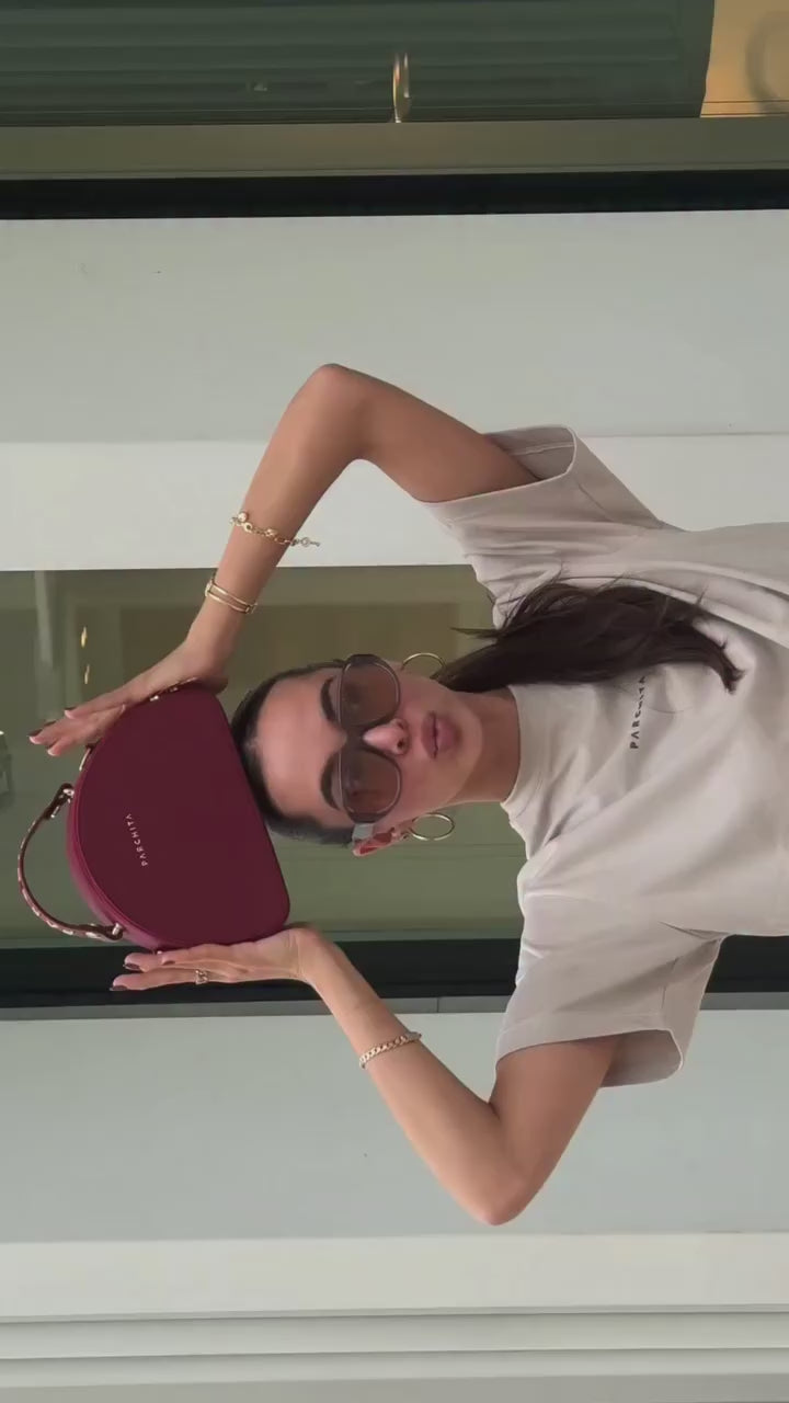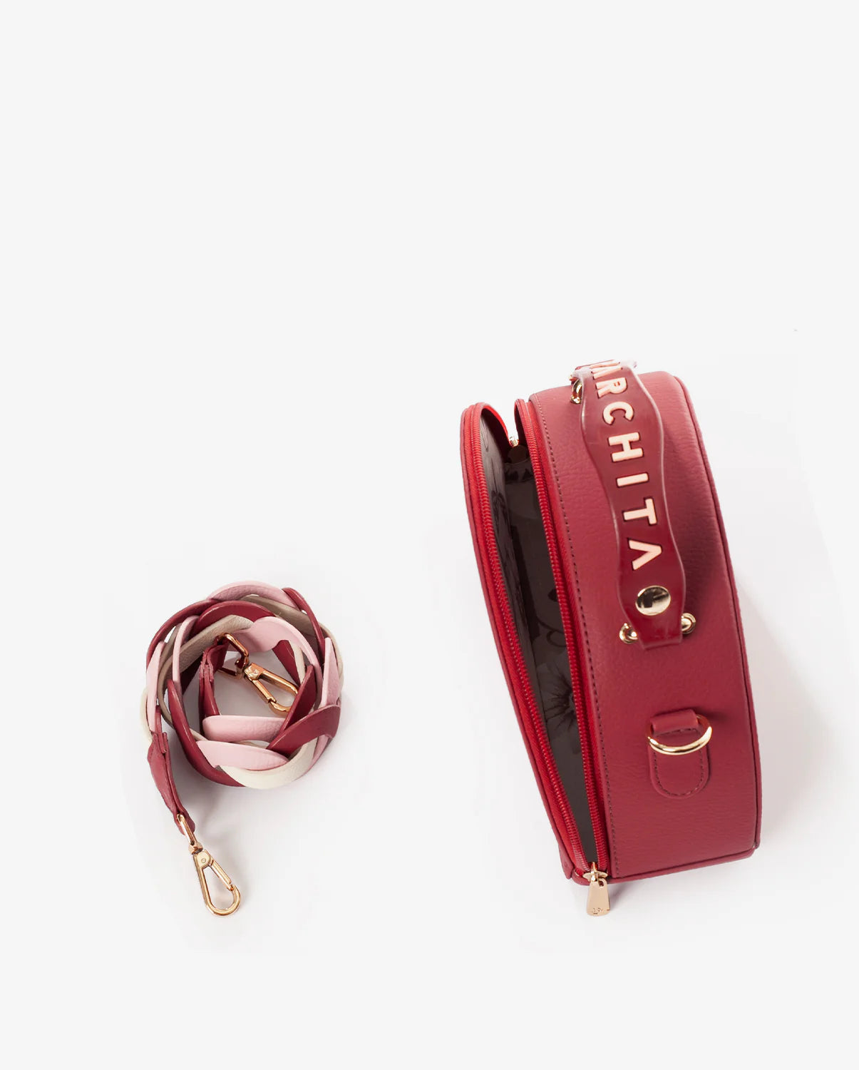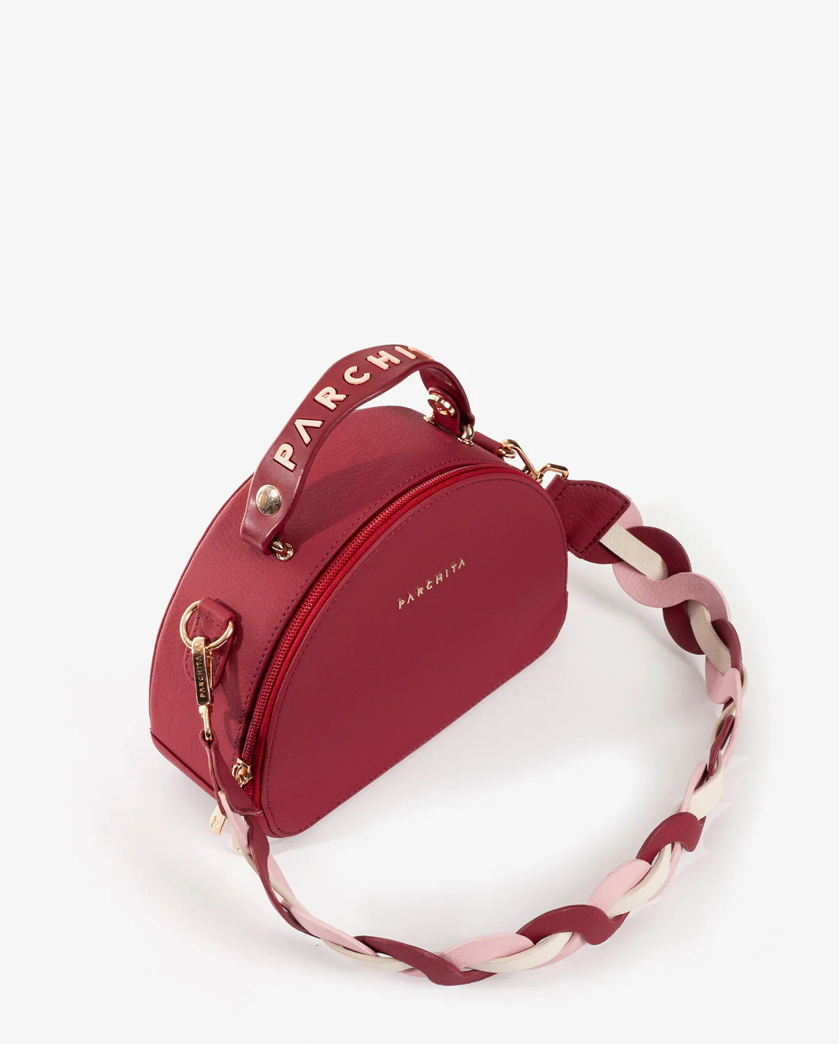 Cartera estructurada en PVC con silueta curva y base plana. Su diseño incorpora un doble cierre metálico y una manija en caucho con aroma a chicle, que destaca por su color en contraste, mientras que su bolsillo interno tipo parche en espaldar te permite llevar tus objetos organizados. Incluye un asa removible elaborada mediante el entrelazado de tres tonos, un detalle que equilibra la modernidad con la artesanía. Una pieza versátil y elegante, perfecta para elevar cualquier look con un aire contemporáneo, alegre y sofisticado.