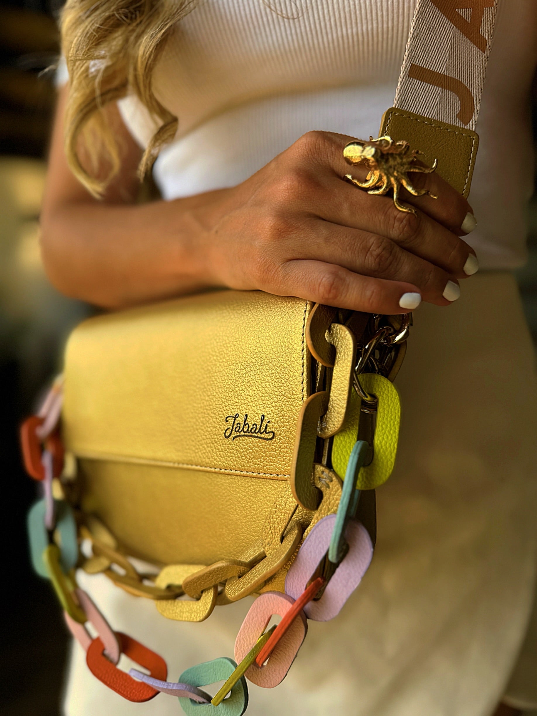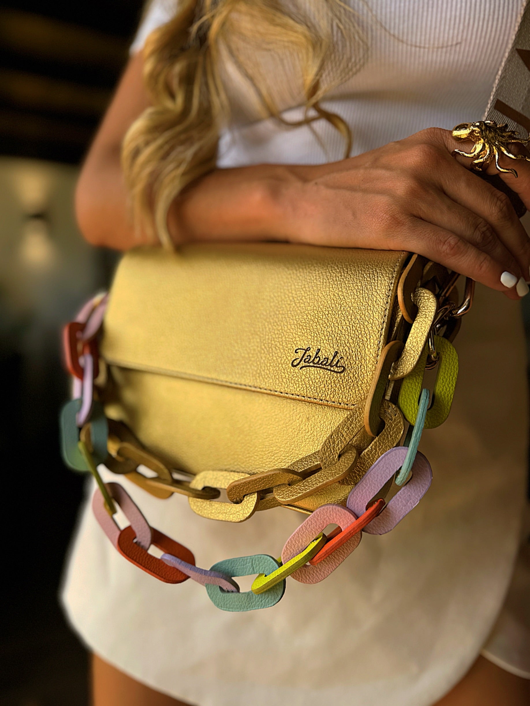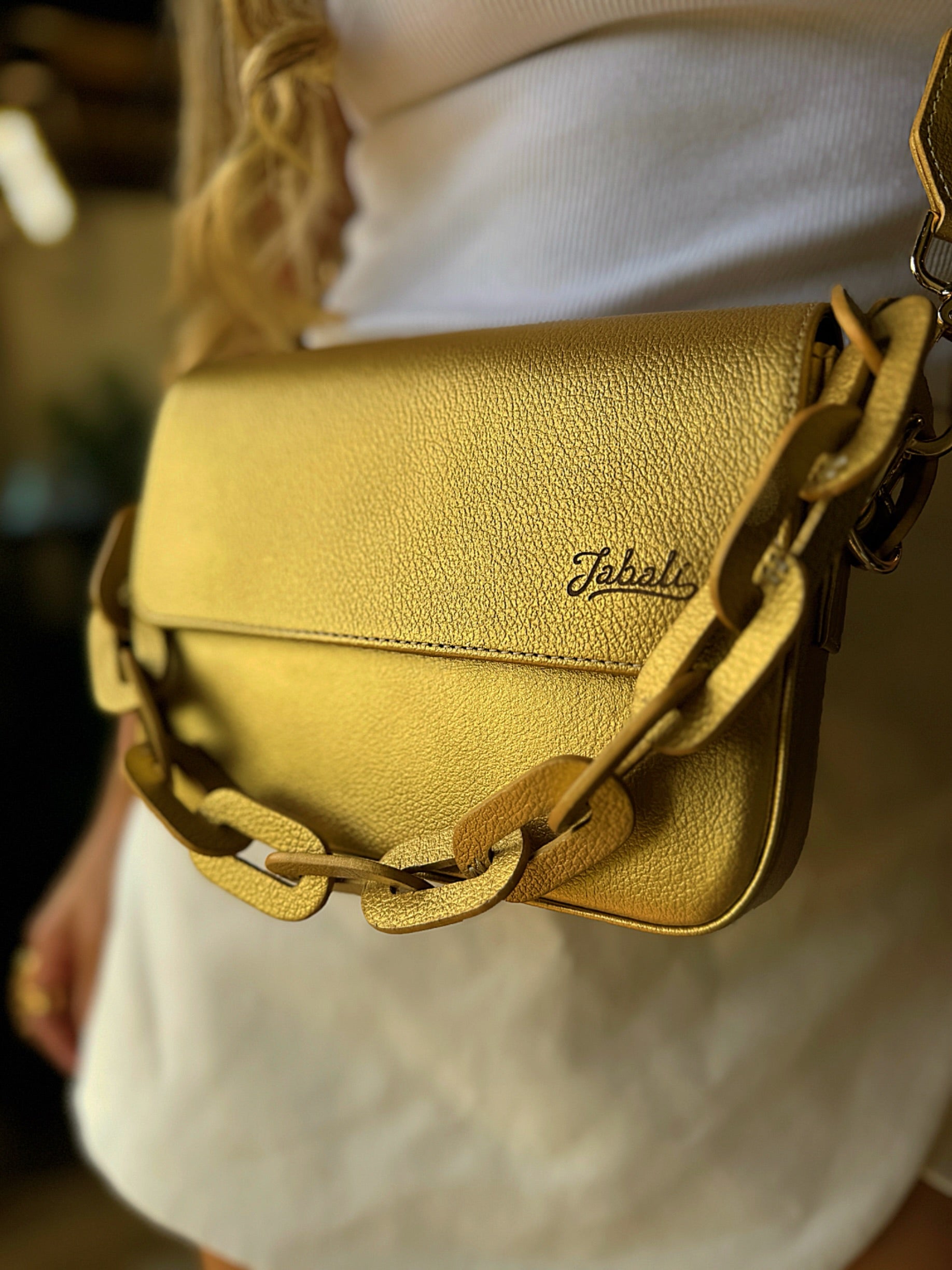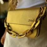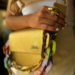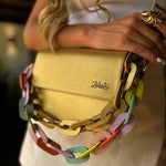 100% cuero con chain en cuero y strap en cuero tono a tono, incluye accesorio del mismo color de la cartera.