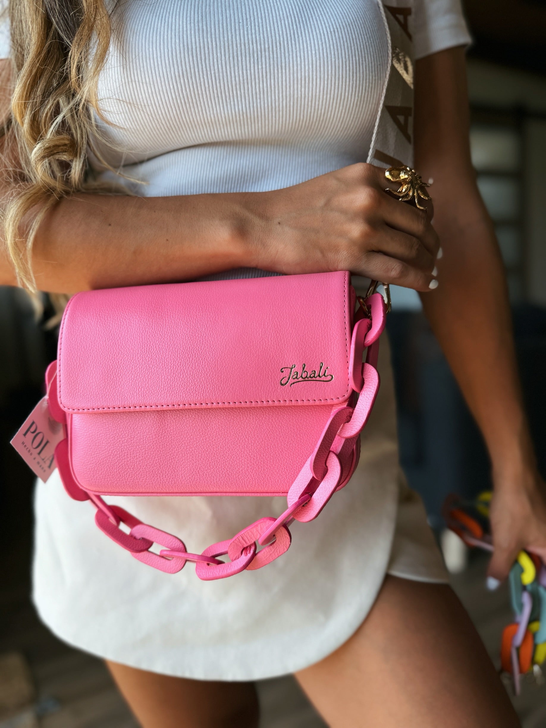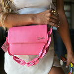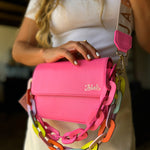 100% cuero con chain en cuero y strap en cuero tono a tono, incluye accesorio del mismo color de la cartera.