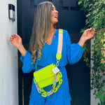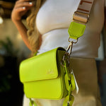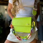 100% cuero con chain en cuero y strap en cuero tono a tono, incluye accesorio del mismo color de la cartera.