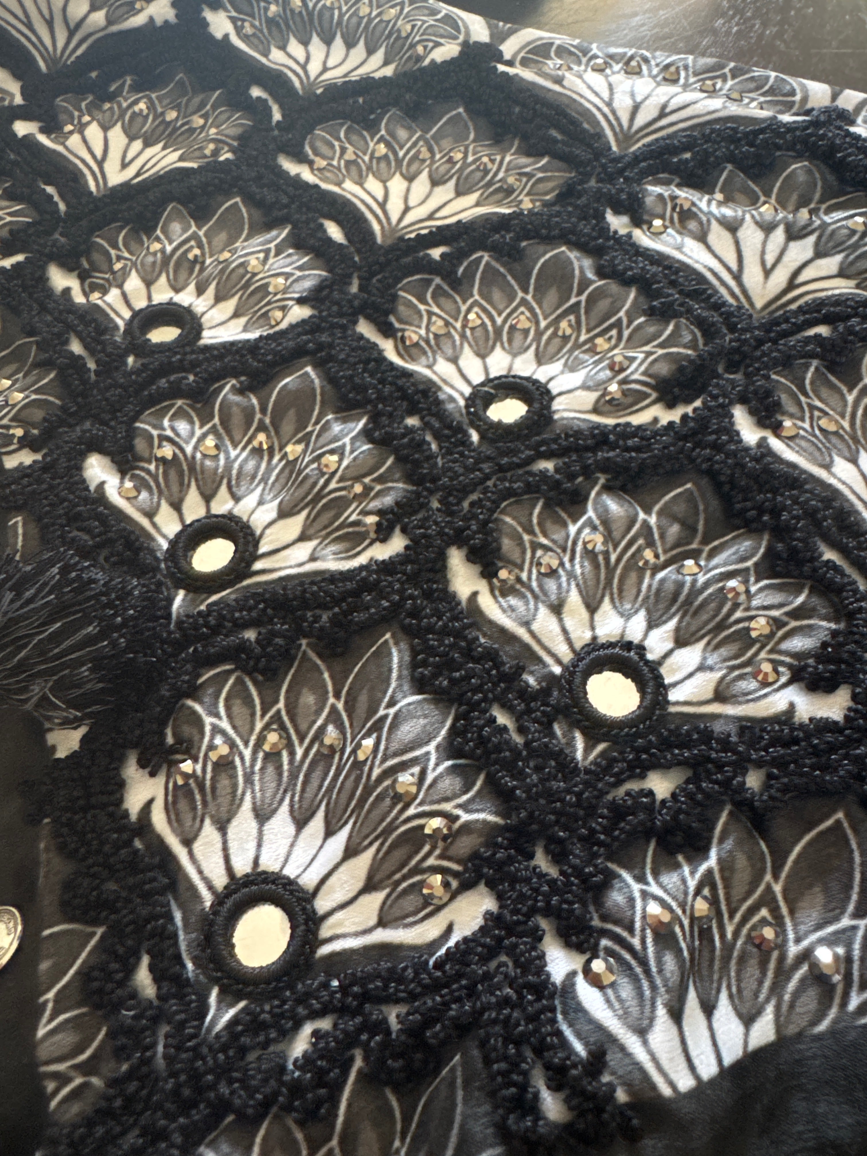 This 100% handmade scarf will give your attire a special touch. In these, the technique of hand embroidery is elevated with crystals, shisha mirrors, coins, and decorative tassels.