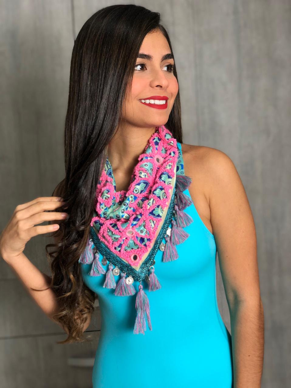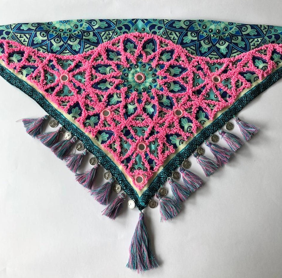 100% handmade scarf that will give your outfit a special touch. Adorned with tiny tassels, small crystals, shisha mirrors, small coins, and decorative fringes.