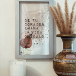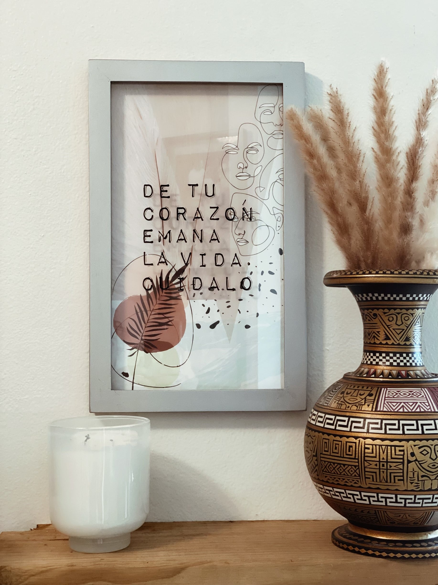 The perfect piece to complete your home, office, airbnb, or any other space where you want a homey and unique vibe filled with positivity, motivation, and inspiration. This painting has a beautifully colorful background that will match any room and good energy. It is upscaled with a pinewood frame that contains a stamped glass with the perfect quote in Spanish: "De tu corazón emana la vida. Cuídalo.". In English, "From your heart arises life. Take care of it.". This motivating quote presented in the most sophisticated and artsy manner will inspire anyone that encounters this piece on a daily basis. Irradiate your day and others' with positivity and inspiration while decorating your surroundings in the most unique way.