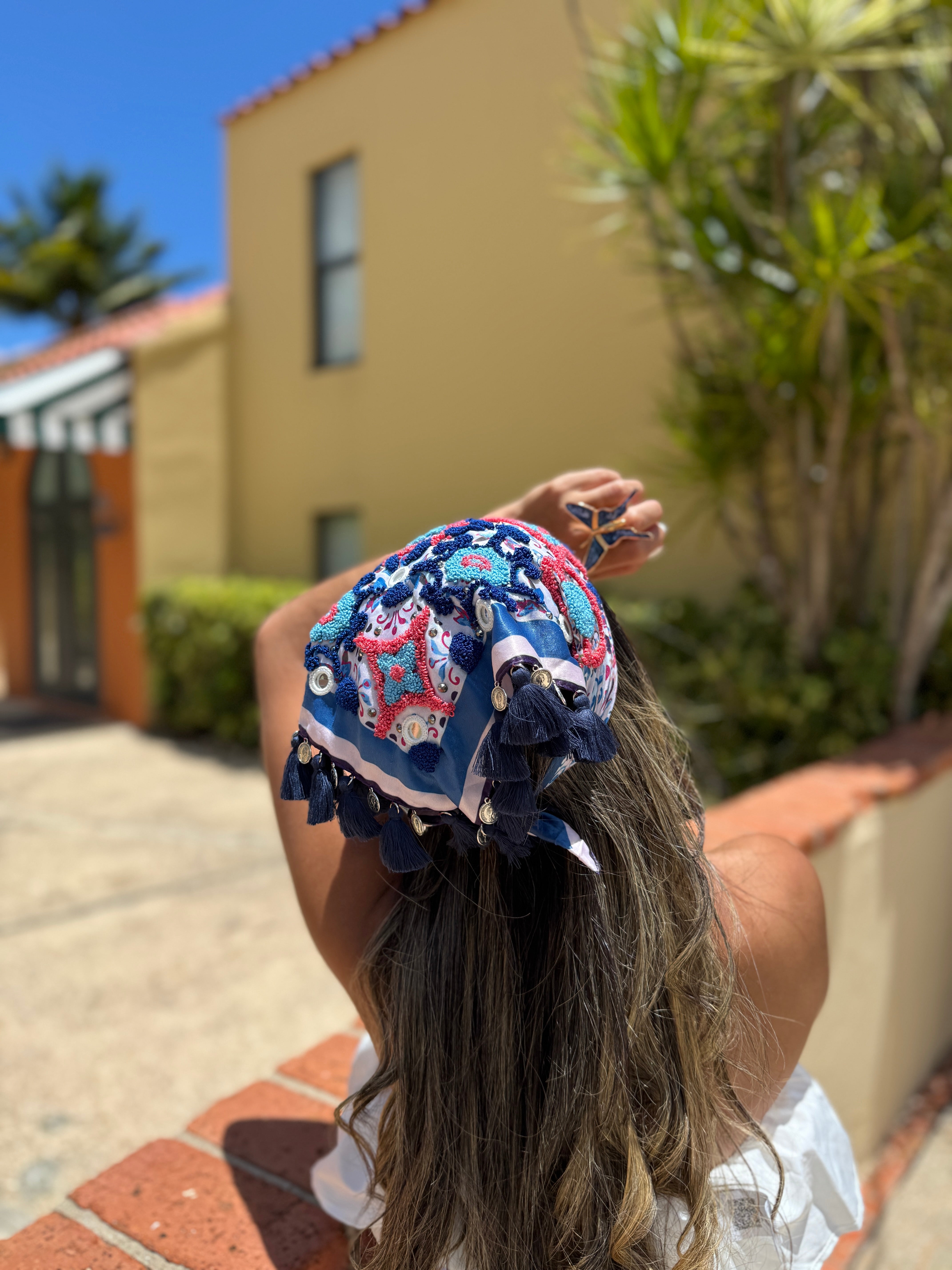 This 100% handmade scarf will give your attire a special touch. In these, the technique of hand embroidery is elevated with crystals, shisha mirrors, coins, and decorative tassels.