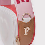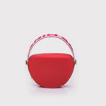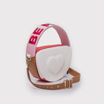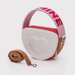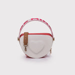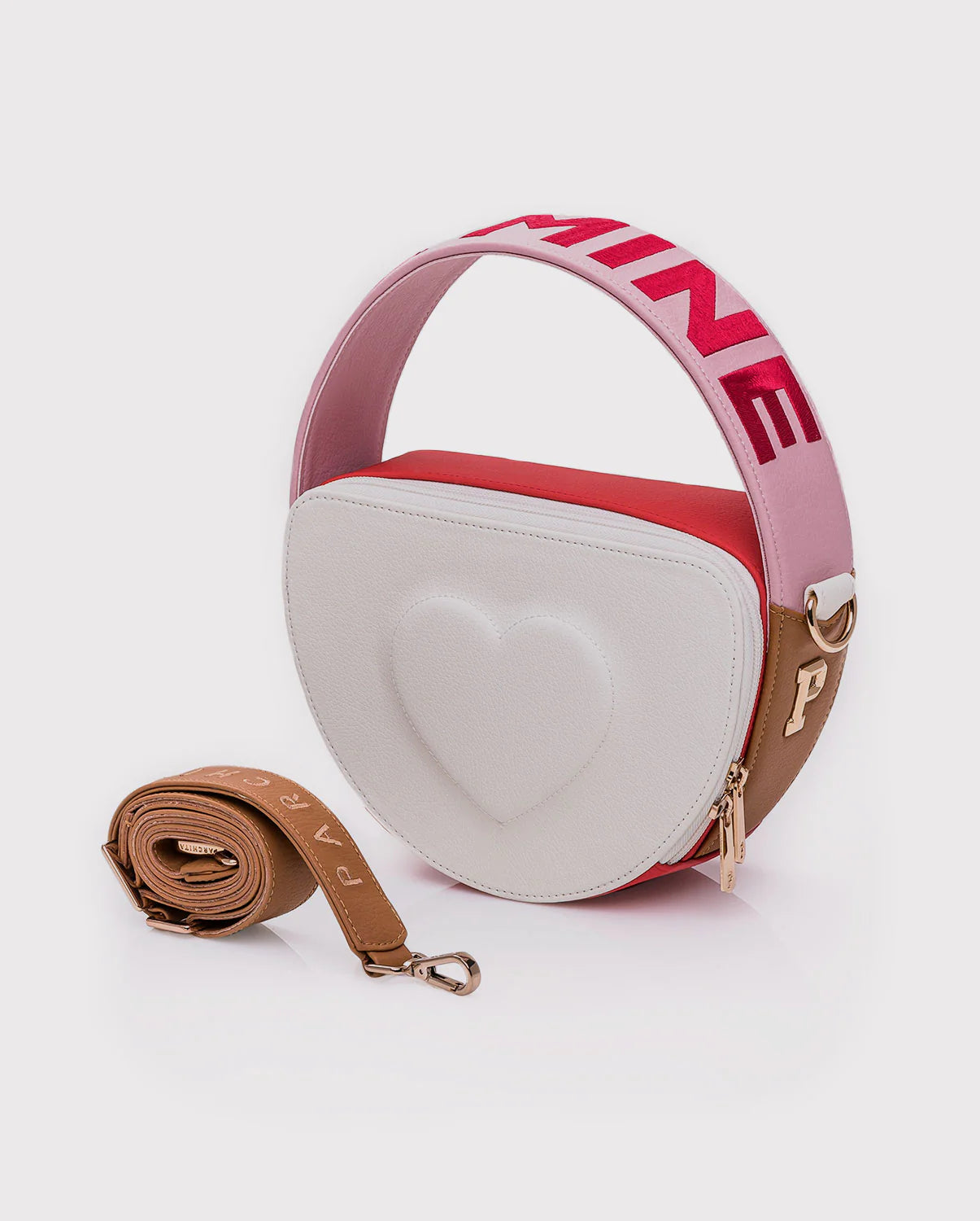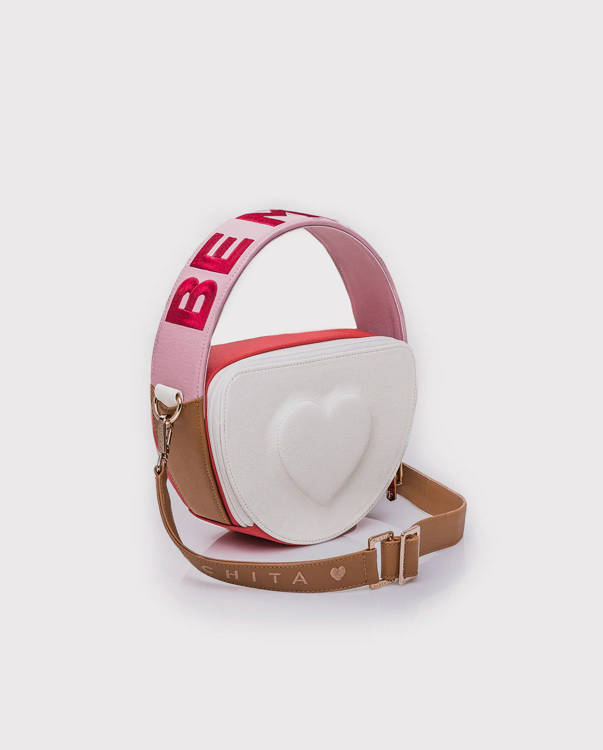 Cartera edición limitada amor y amistad. Su diseño circular estructurado en PVC, con contraste de colores colores crea una cartera dinámica y femenina. El repujado frontal en forma de corazón aporta un toque artesanal, mientras la frase “BE MINE” bordada a contraste en el asa complementa la estética romántica.