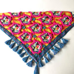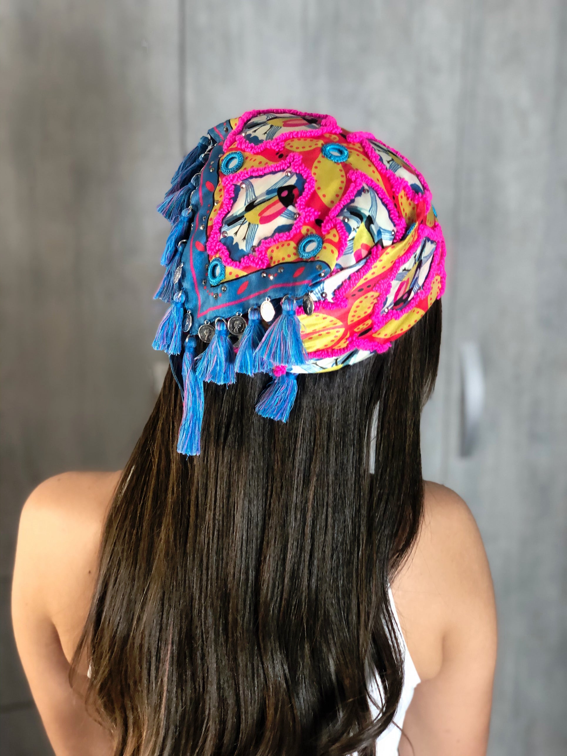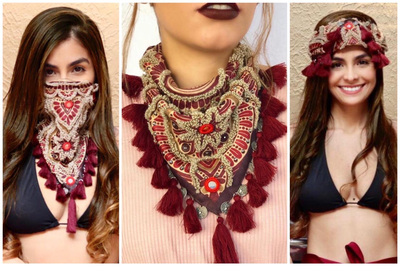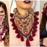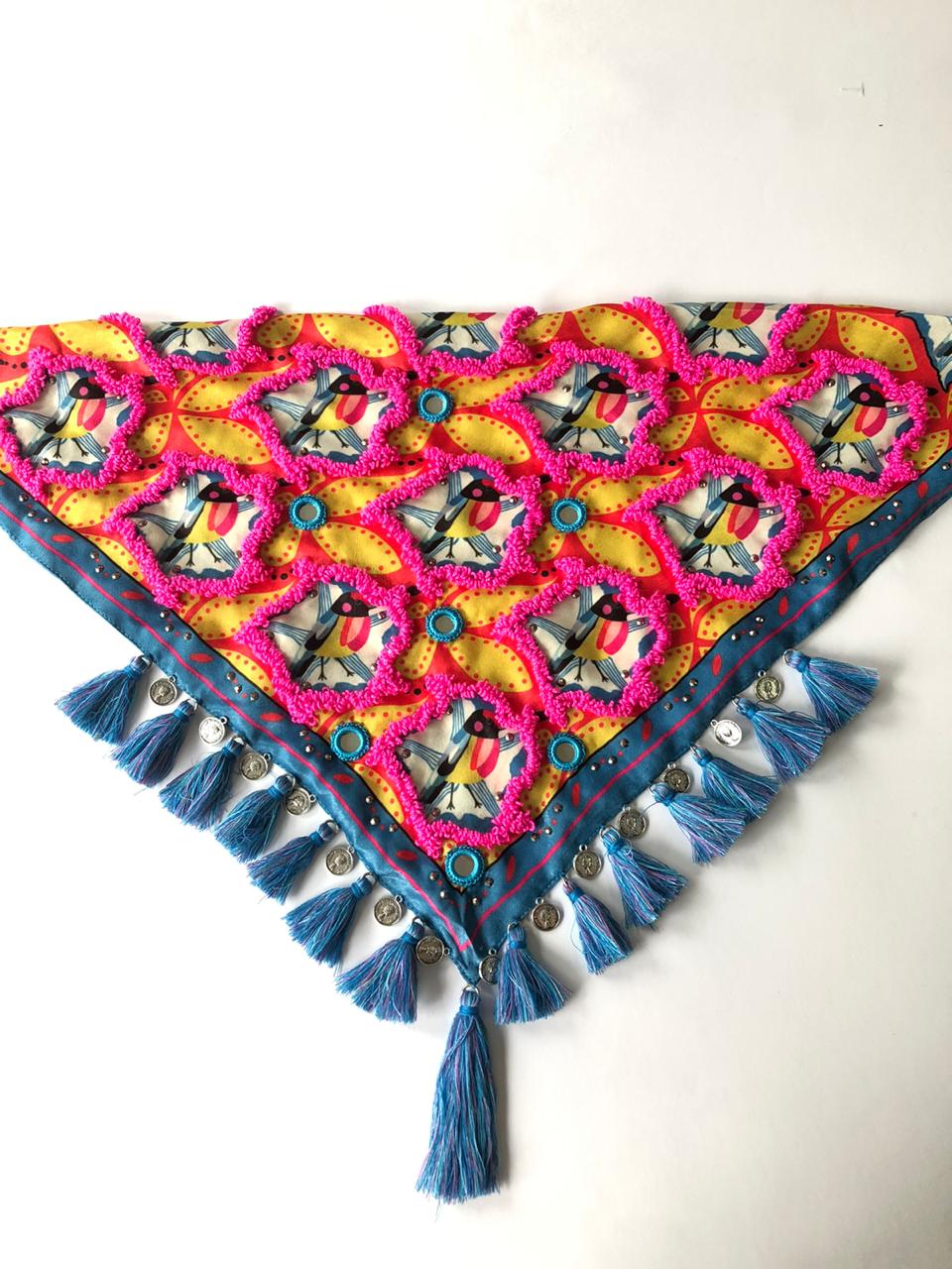 100% handmade scarf that will give your outfit a special touch. Adorned with tiny tassels, small crystals, shisha mirrors, small coins, and decorative fringes.