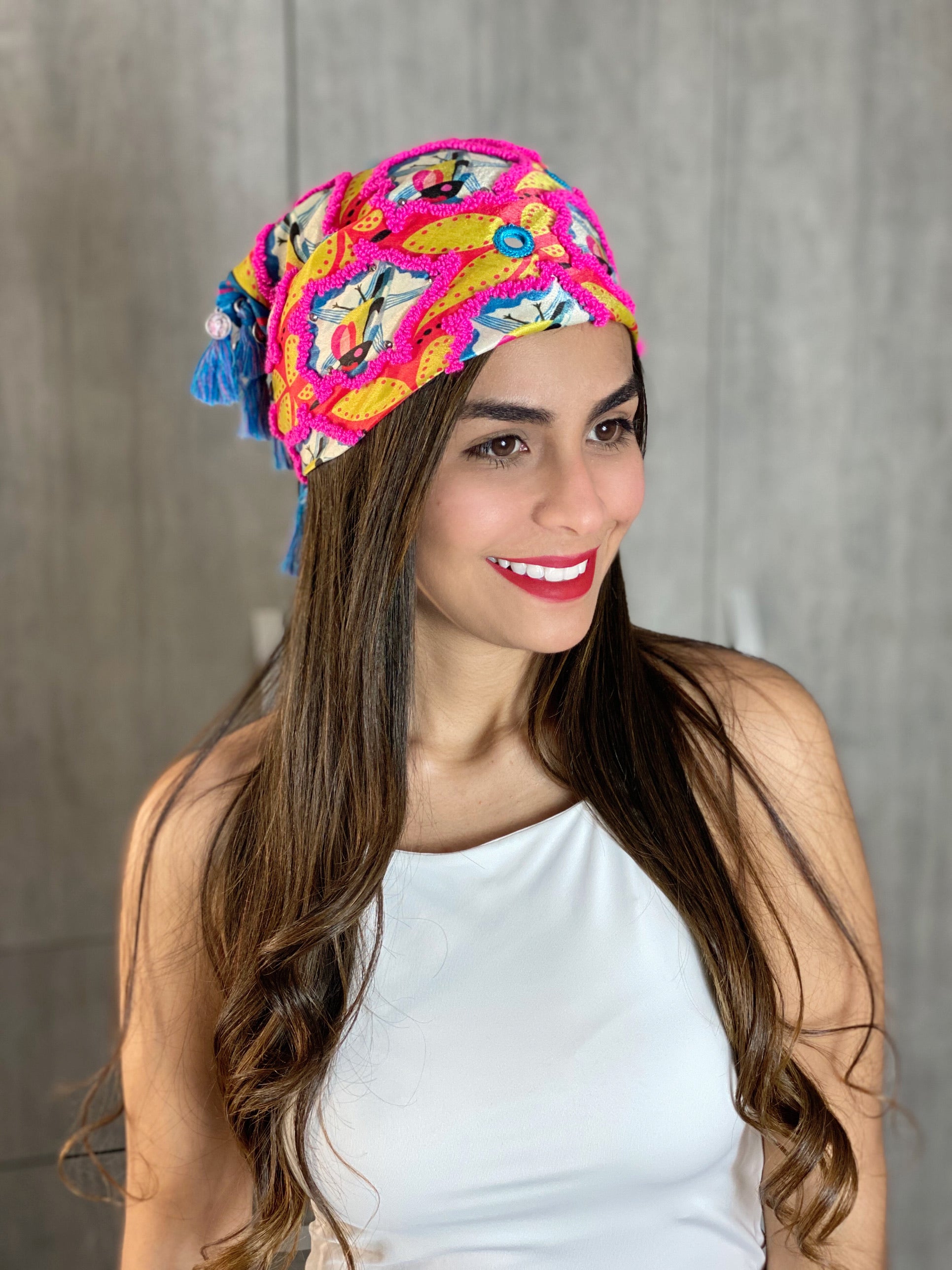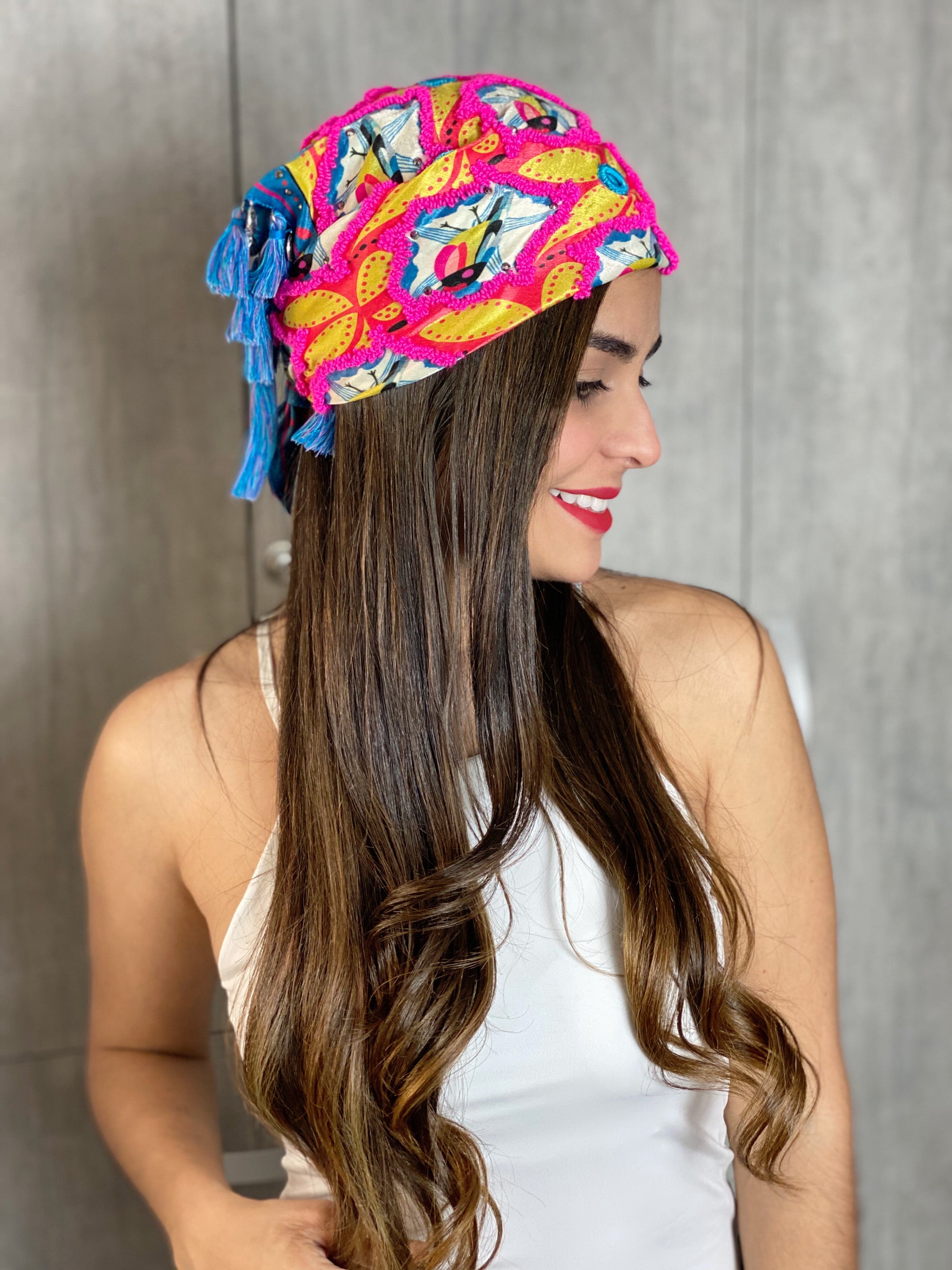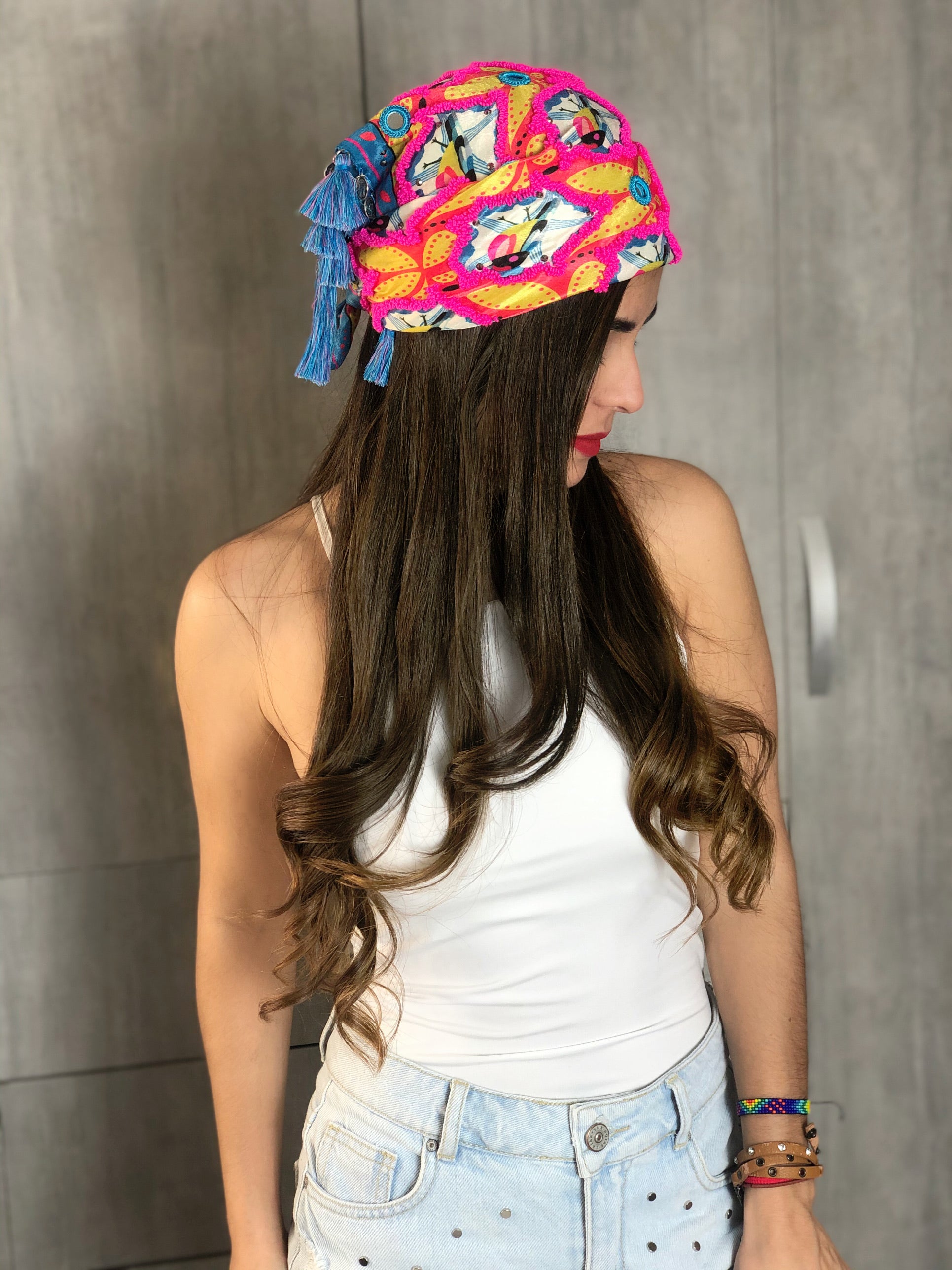 100% handmade scarf that will give your outfit a special touch. Adorned with tiny tassels, small crystals, shisha mirrors, small coins, and decorative fringes.