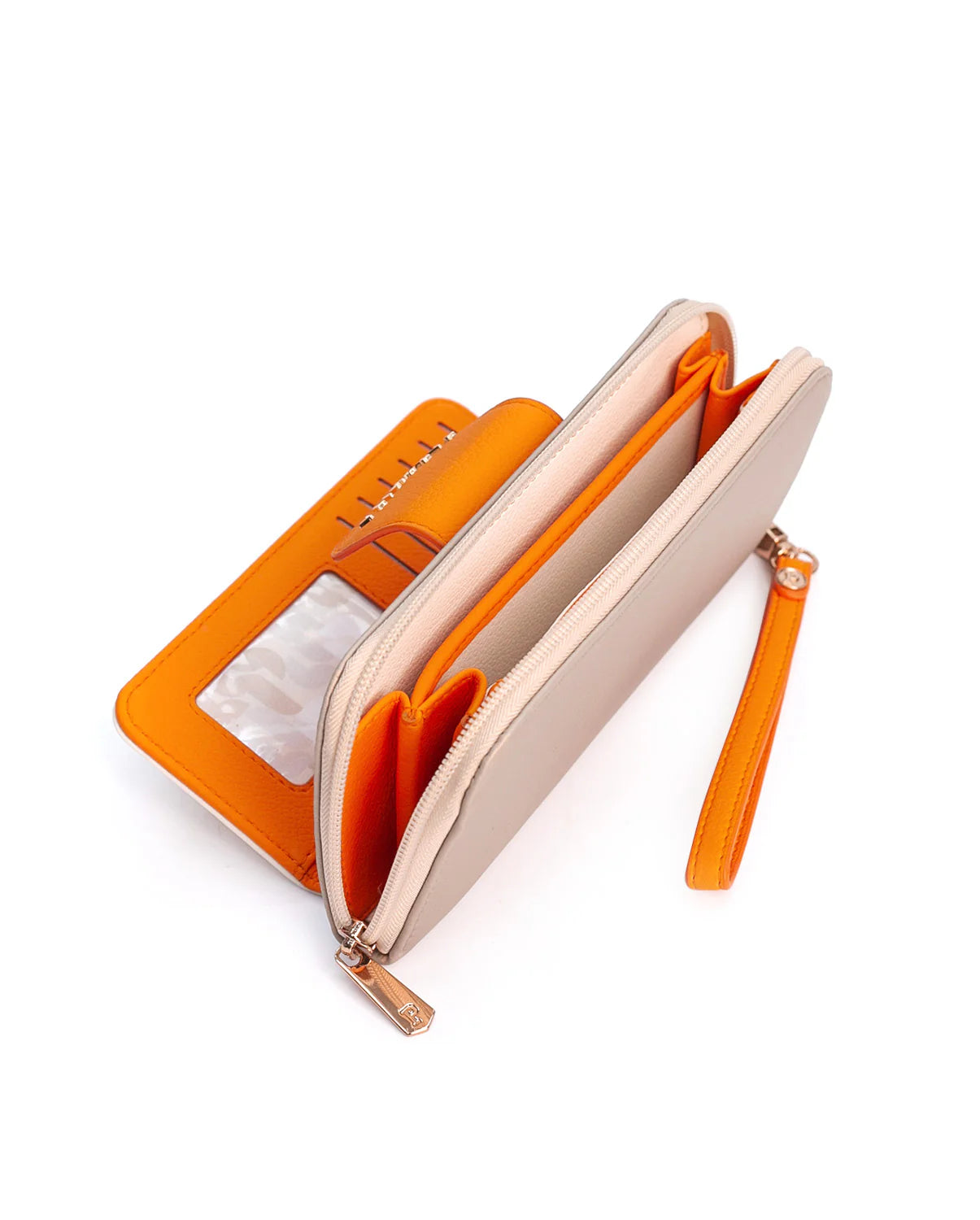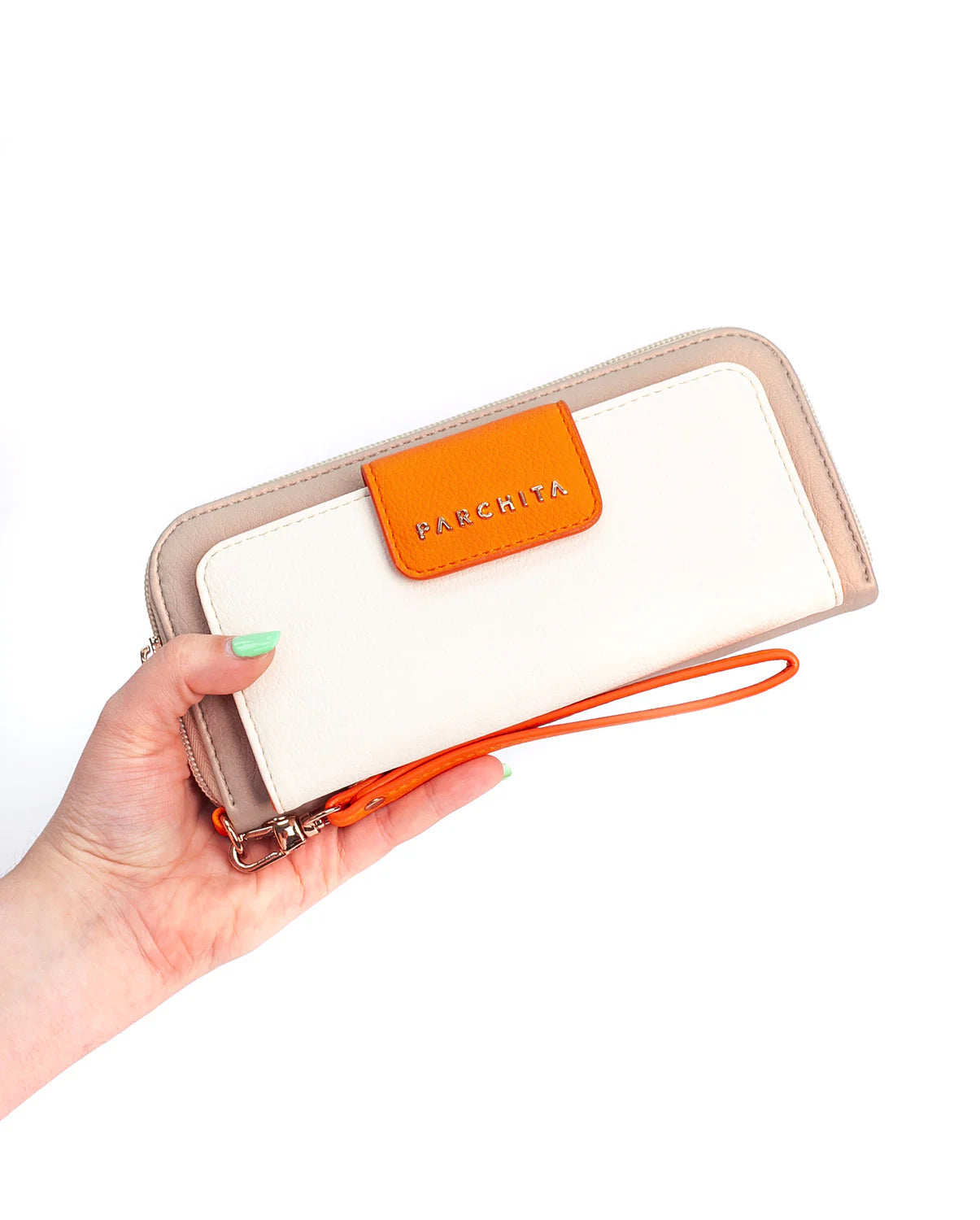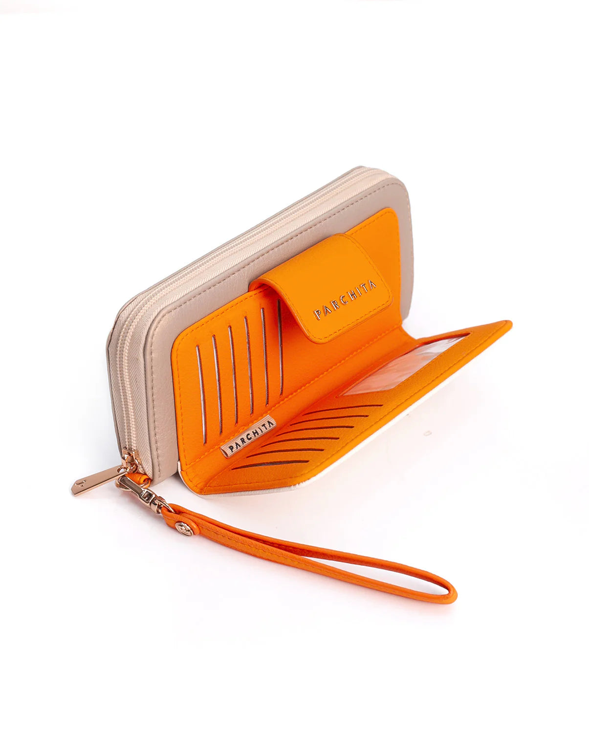 UTILIDAD Bolsillos tarjeteros múltiples tarjetero en frente tipo bifold con tapa y broche. Billetera larga con cremallera bolsillo porta billetes y monedero con cremallera. Lleva correa de mano de 20cm con mosquetón.