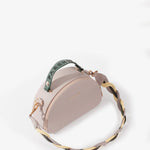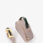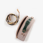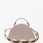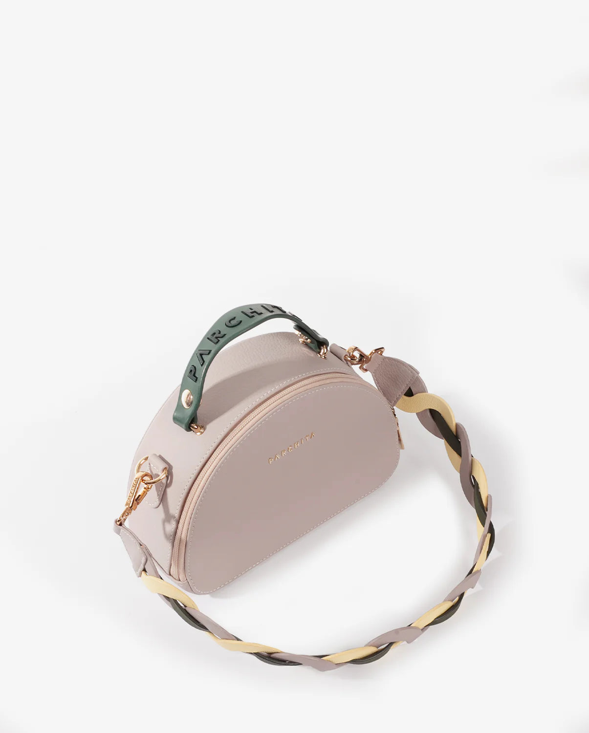 Cartera estructurada en PVC con silueta curva y base plana. Su diseño incorpora un doble cierre metálico y una manija en caucho con aroma a chicle, que destaca por su color en contraste, mientras que su bolsillo interno tipo parche en espaldar te permite llevar tus objetos organizados. Incluye un asa removible elaborada mediante el entrelazado de tres tonos, un detalle que equilibra la modernidad con la artesanía. Una pieza versátil y elegante, perfecta para elevar cualquier look con un aire contemporáneo, alegre y sofisticado.