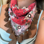 This 100% handmade scarf will give your attire a special touch. In these, the technique of hand embroidery is elevated with crystals, shisha mirrors, coins, and decorative tassels.