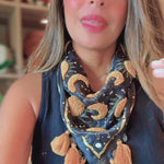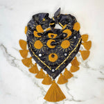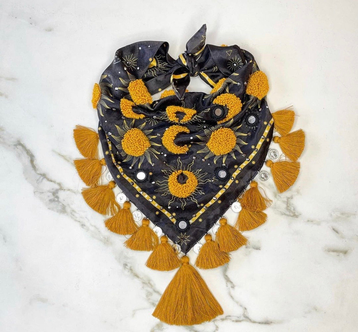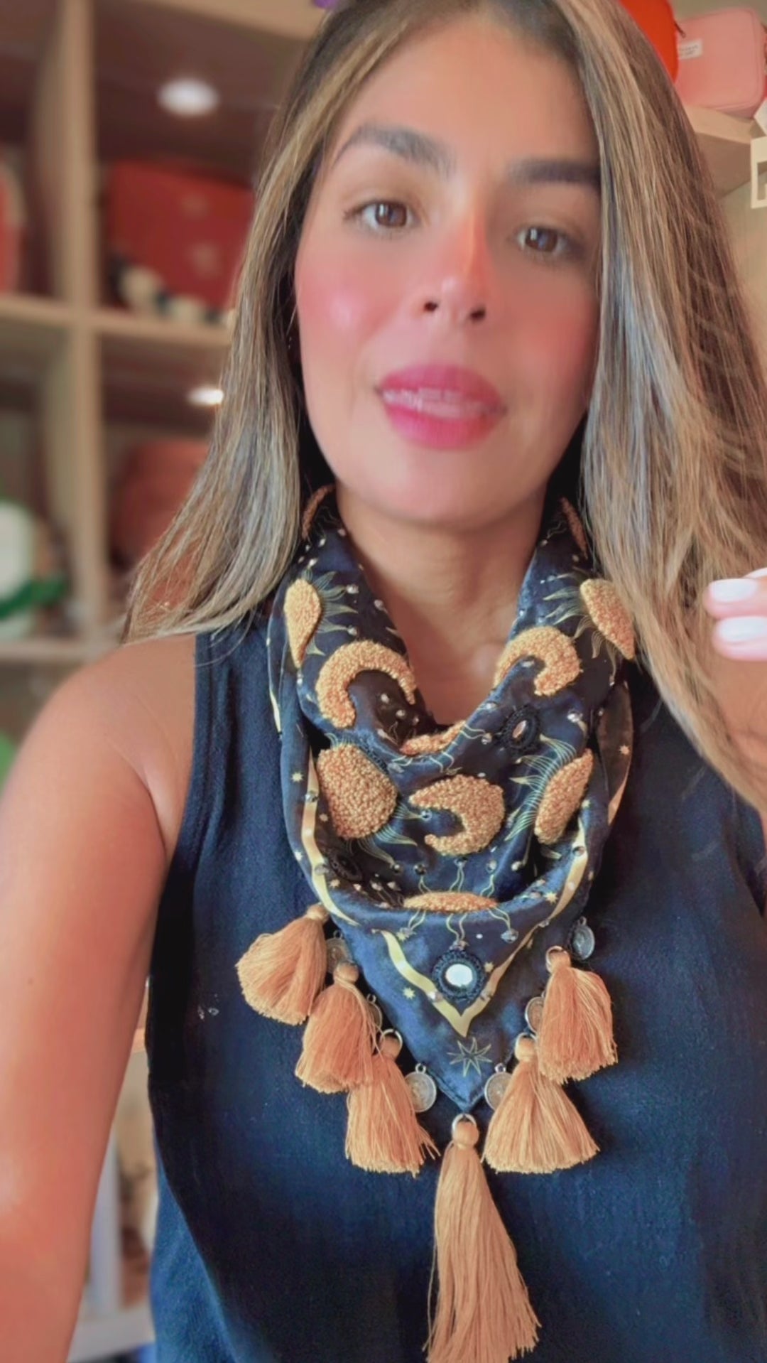 This 100% handmade scarf will give your attire a special touch. In these, the technique of hand embroidery is elevated with crystals, shisha mirrors, coins, and decorative tassels.