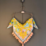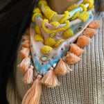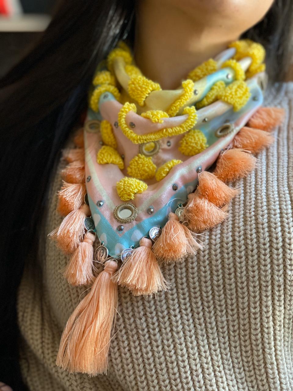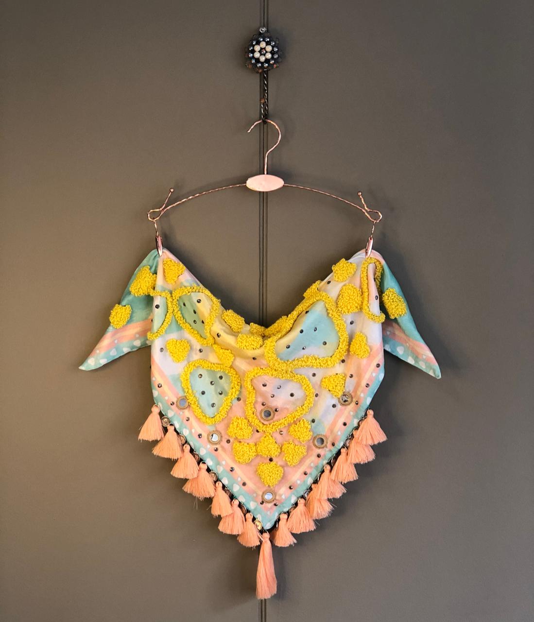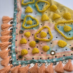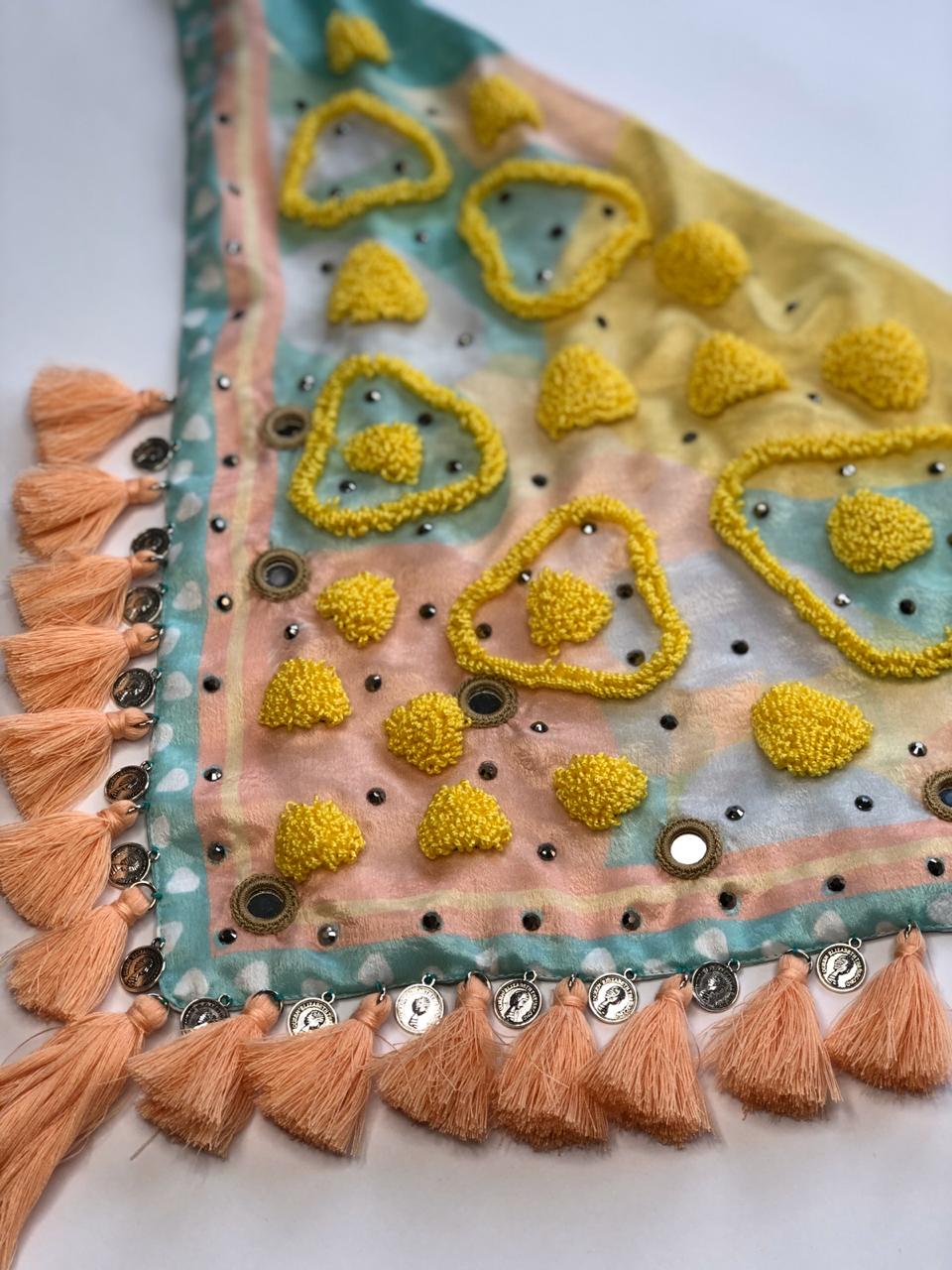 100% handmade scarf that will give your outfit a special touch. Adorned with tiny tassels, small crystals, shisha mirrors, small coins, and decorative fringes.