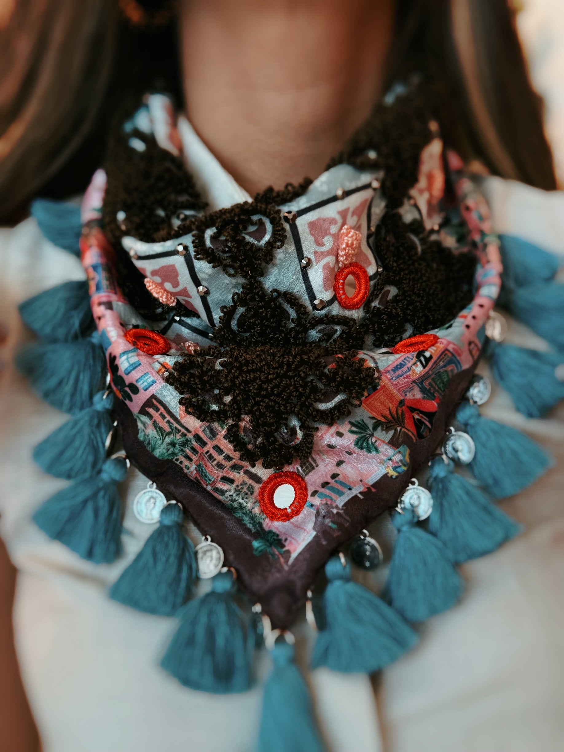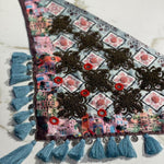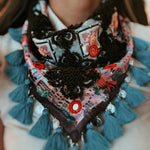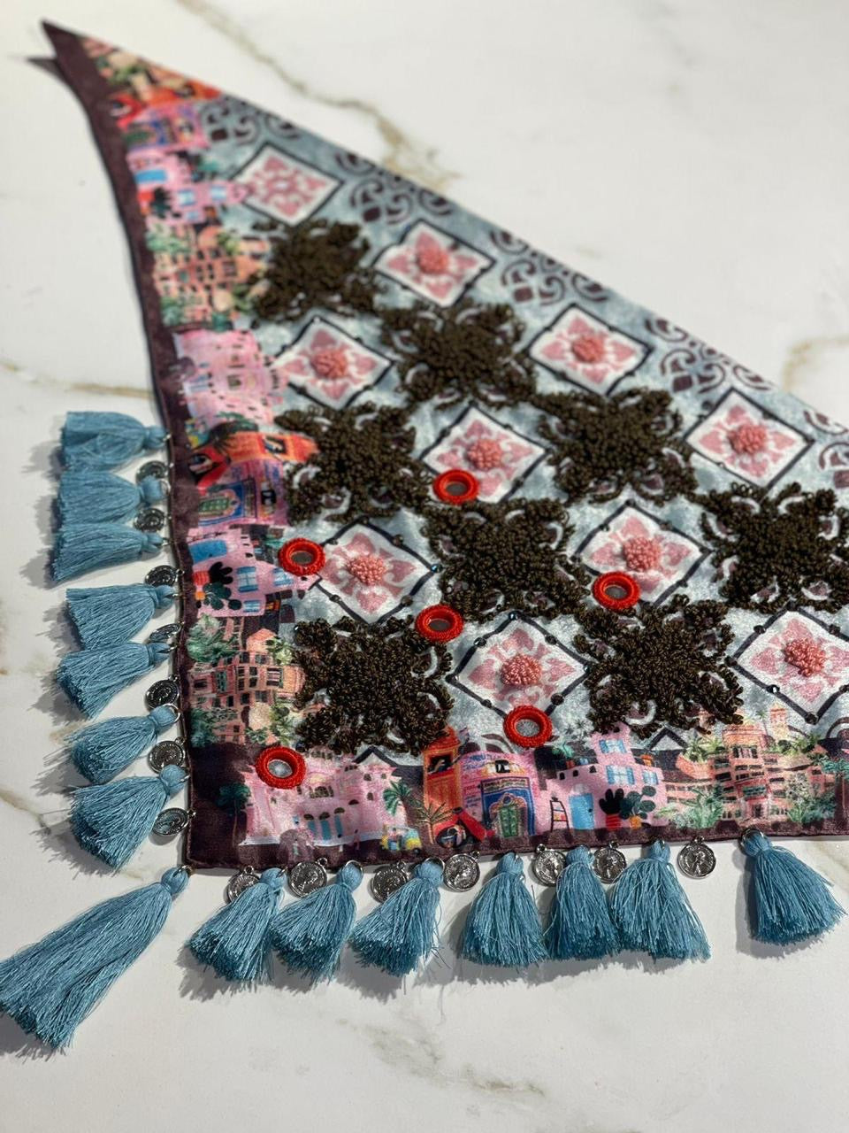 This 100% handmade scarf will give your attire a special touch. In these, the technique of hand embroidery is elevated with crystals, shisha mirrors, coins, and decorative tassels.