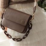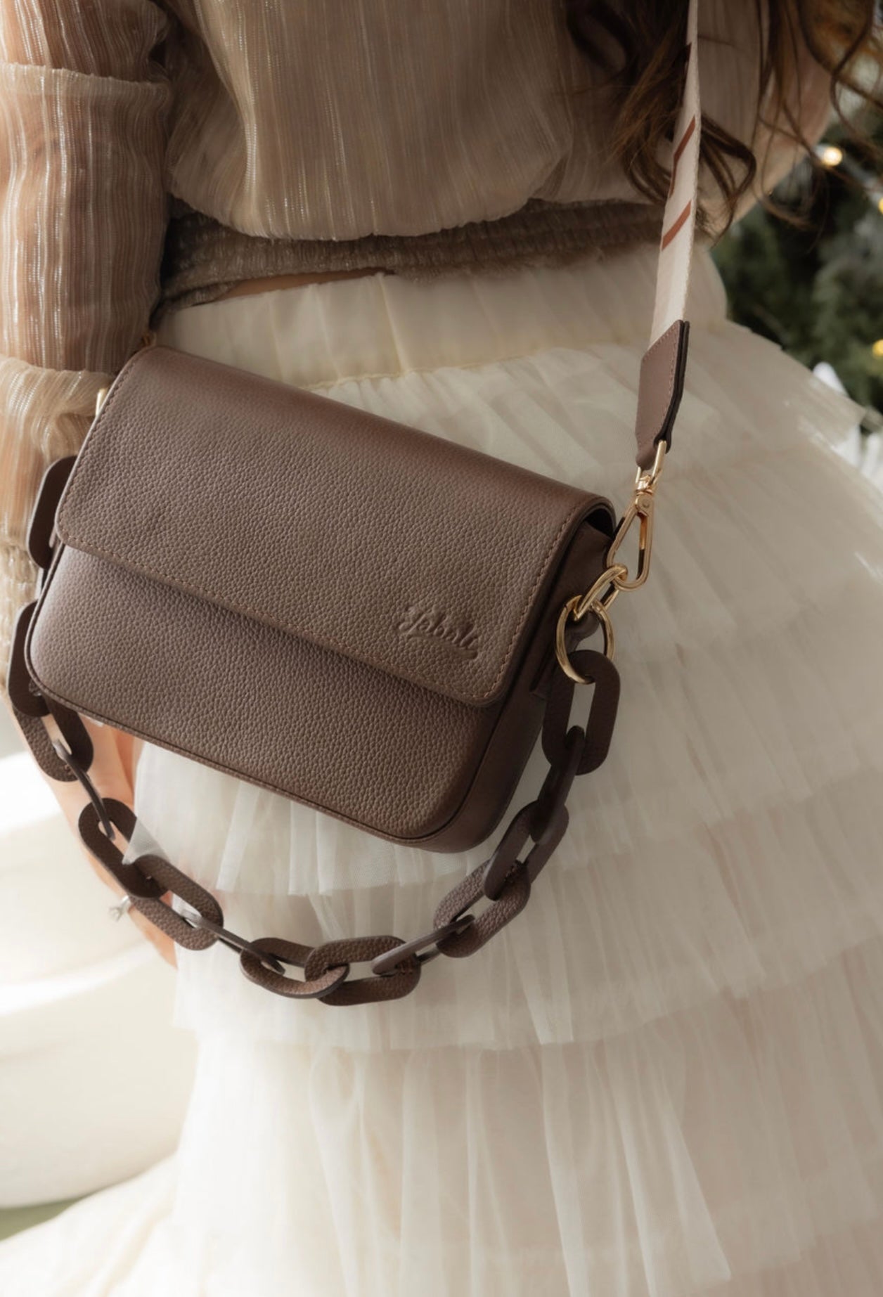 100% cuero con chain en cuero y strap en cuero tono a tono, incluye accesorio del mismo color de la cartera.