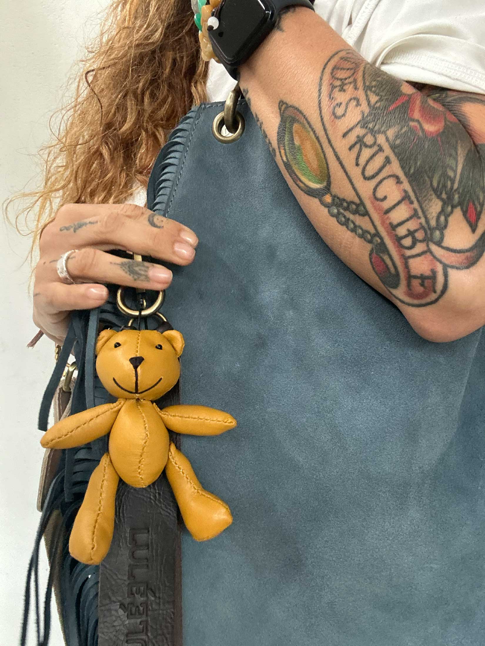 Osito Oba Oba es un accesorio único para acompañar tus bags. Elaborado a mano, 100% en gamuza, un exquisito cuero suave con textura peludita.