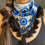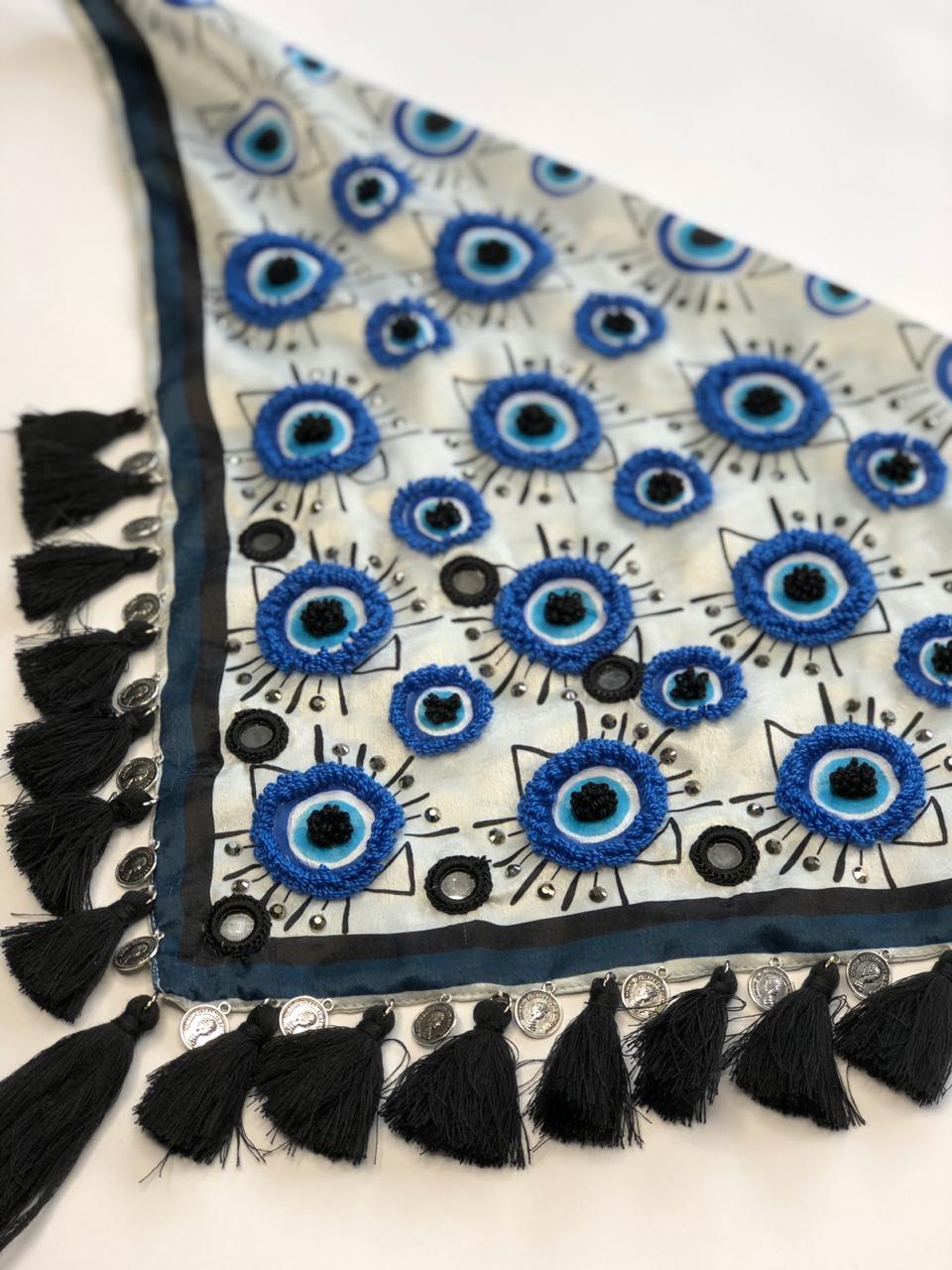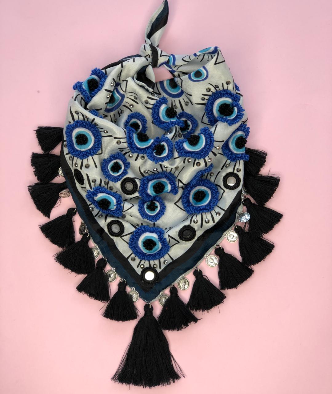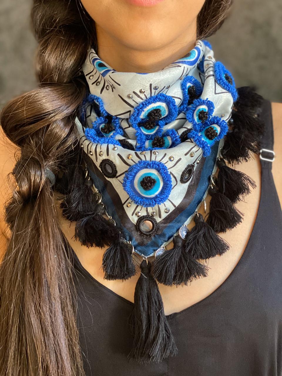 This 100% handmade scarf will give your attire a special touch. In these, the technique of hand embroidery is elevated with crystals, shisha mirrors, coins, and decorative tassels.