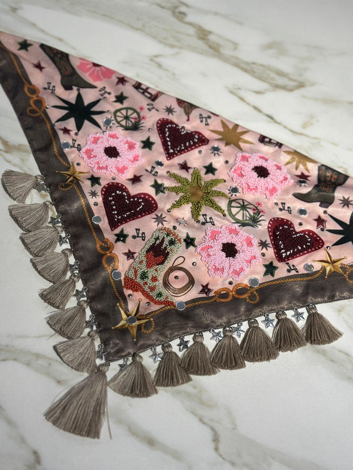 This 100% handmade scarf will give your attire a special touch. In these, the technique of hand embroidery is elevated with crystals, shisha mirrors, coins, and decorative tassels.